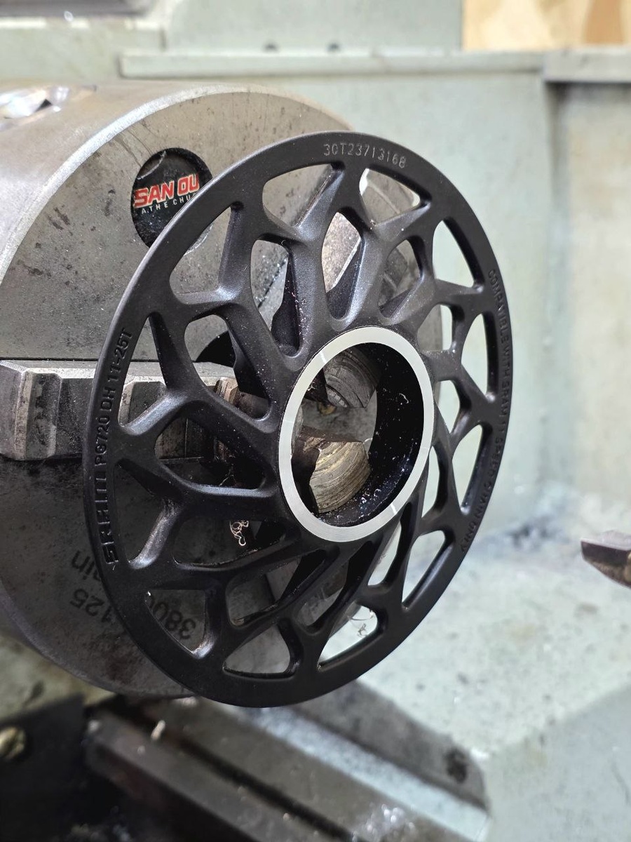 Это семискоростная даунхилльная кассета, и примечательна она прежде всего тем, что в отличии от более дорогих кассет XG-795, она полностью разборная, надевается на стандартный барабан Shimano HG (HyperGlide) и, самое главное, имеет в своём комплекте отделяемую пластиковую защиту от попадания цепи между кассетой и спицами. Во всём хороша, кроме одного: эта падла восьмерит. Если учесть, что расстояние между звёздами даунхилльных кассет Sram такое же, как у 11-скоростной обычной кассеты, и что переключатель этой серии обычно нехило болтается на петухе, то ни о какой чёткости переключения, особенно в гоночном режиме, речь идти не может. Лечение до безобразия простое: берём защиту, базируем в токарный станок, делаем канавку под тугую посадку для установки в неё стандартного алюминиевого колечка (того, которое ставят перед кассетой, если она болтается на барабане), прессуем в защиту колечко, повторно базируем это всё дело в токарник, торцуем колечко, получаем на выходе замечательную констр