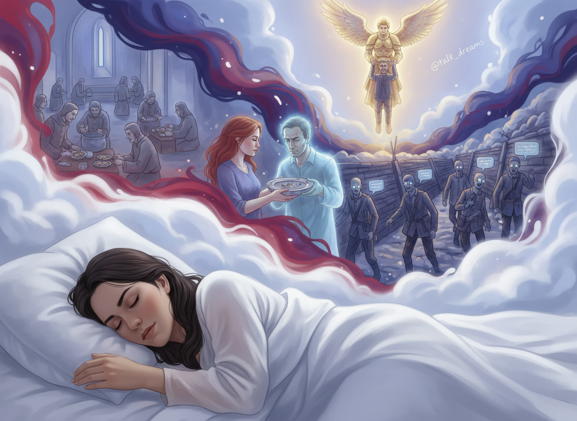 😴 К чему снится ангел? Viktoriia описывает свой сон так: Приснился сон другу. Он был в церкви и они с командой готовили блюдо, потом кормили им прихожан. После этого начали готовить для себя. Он ушел домой, а на следующий день ему 2 женщины, одна живая, другая мертвая, принесли старое блюдо. Ему это не понравилось. Потом он оказался на войне. В окопах мертвецы могли двигаться и говорить. Он ходил по воздуху защитой ангела. Все видели это и говорили, что его защищает могущественное существо. Ангел его забрал и они летали. 🤔 Что же значит этот сон? Кстати, вы тоже можете прислать свой сон для трактования нашему боту в телеграмм — https://t.me/ReceiverDream_bot В данном сне есть несколько ключевых символов, которые стоит рассмотреть: 🐦 Церковь и еда: Церковь символизирует духовное сообщество и место поклонения, а приготовление и раздача еды может символизировать служение и духовное питание. Подготовка пищи для других прежде, чем для себя, подчеркивает альтруизм, служение и заботу о дру