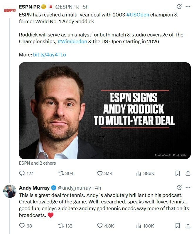 Энди Маррей одобряет подписание Энди Роддика на ESPN для освещения US Open и Wimbledon