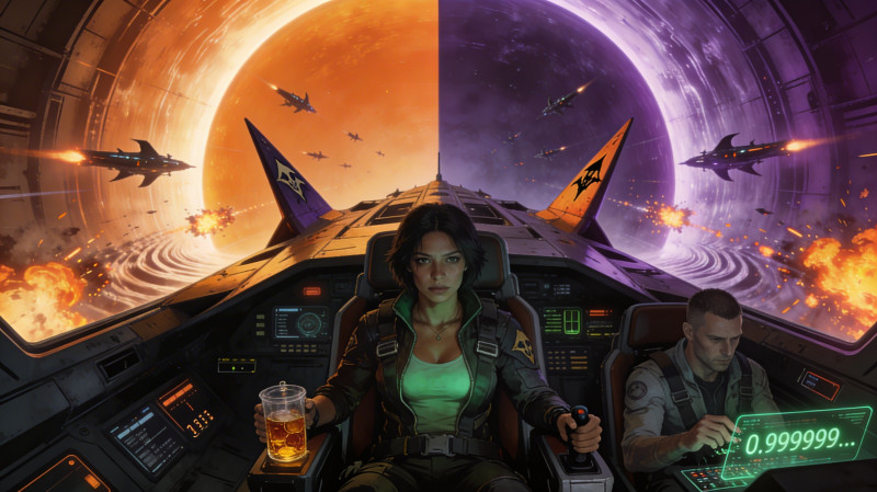 Груз казалита на борту должен удвоиться, такова чёртова физика. “Стрела” находилась на оранжевой стороне портала. Урму подташнивало. Колебания метрики рвали каждую клетку. Табло линейного времени давно сошло с ума. “Ничего, ничего. Эта дурная бесконечность закончится когда-нибудь”. – Алекс, быстрее с грогом, меня мутит. – Момент, кэп. Наполняю контейнер. Оказаться в камбузе самое последнее, что хотела Урма, там можно столкнуться со своими же двойниками. Датчик плотности казалита в трюме зашкаливало, груз искажает пространство-время не хуже самого портала, особенно в районе камбуза, где его плотность достигает пика. На фиолетовой стороне портала её казалита хватит на... Казалит это всё, от универсальной валюты до топлива гипердвижков. И добывается далеко за краями плоского мира. Урма потеряла счёт, что можно купить на то, что они уже набрали. Алекс досчитал до цены Т-точки, дальше его знания заканчивались, а сколько было ещё прыжков после этого. Может, хватит на целый сектор во внешнем