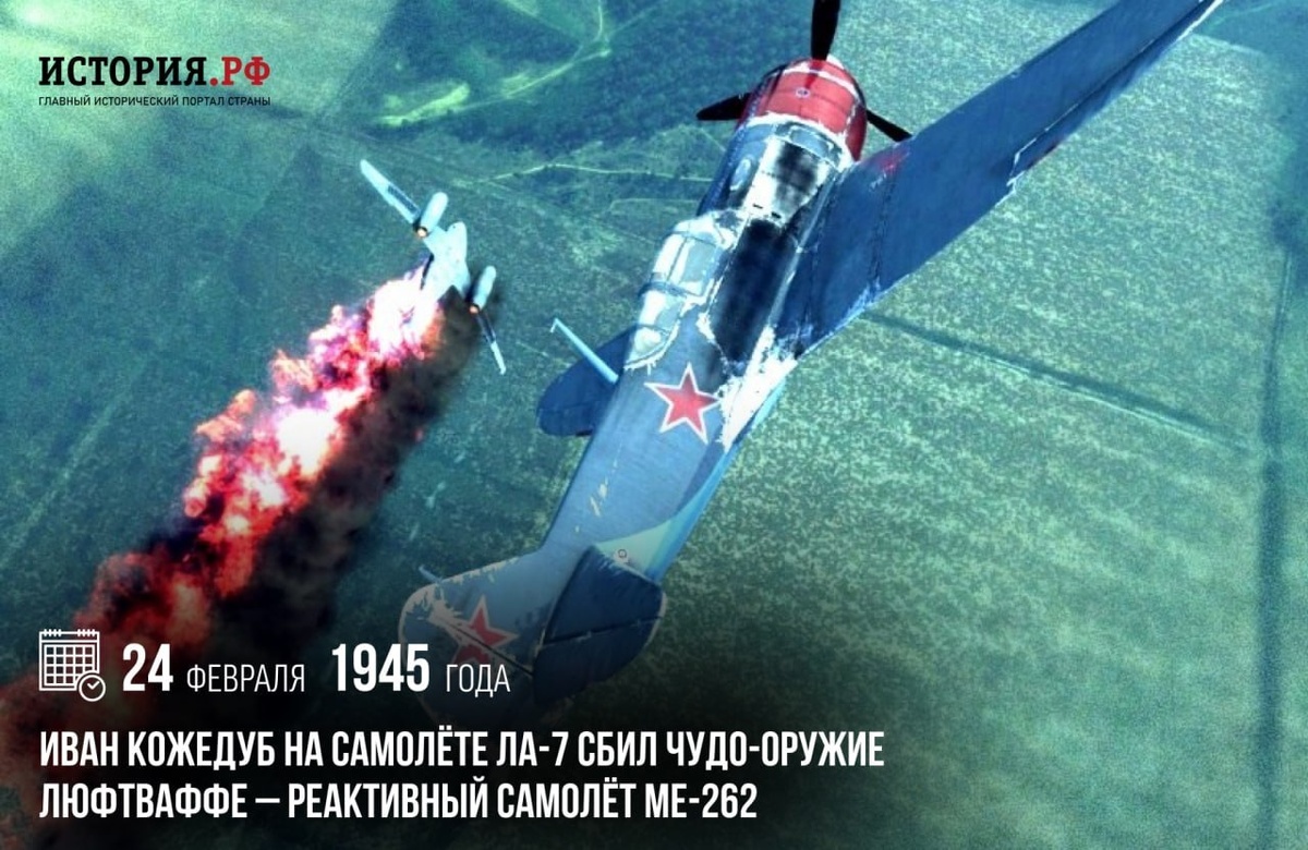 Иван Кожедуб на самолете Ла-7 сбил чудо-оружие люфтваффе — реактивный самолет Ме-262. Это было первое в истории отечественной авиации уничтожение в воздушном бою реактивного самолета противника. «...Немецкий самолет стал разворачиваться влево, в мою сторону. Дистанция резко сократилась, и я сблизился с врагом. С невольным волнением открываю огонь. И реактивный самолет, разваливаясь на части, падает» (Иван Кожедуб) Иван Кожедуб — трижды Герой Советского Союза, самый результативный летчик-истребитель в авиации всех союзных армий — СССР, Великобритании, США — в годы Второй мировой войны, герой не только Великой Отечественной, но и «корейской» войны, а также Маршал авиации СССР #ПамятныеДатыВоеннойИсторииОтечества #ДеньВИстории #ГодЗащитникаОтечества #80ЛетВеликойПобеды Источник: https://vk.ru/wall-216215303_2997 Подпишитесь на наши группы ВКонтакте, в Одноклассниках, в Телеграм - читайте, смотрите и комментируйте информационные материалы, предлагайте свои! Источник: Открыть