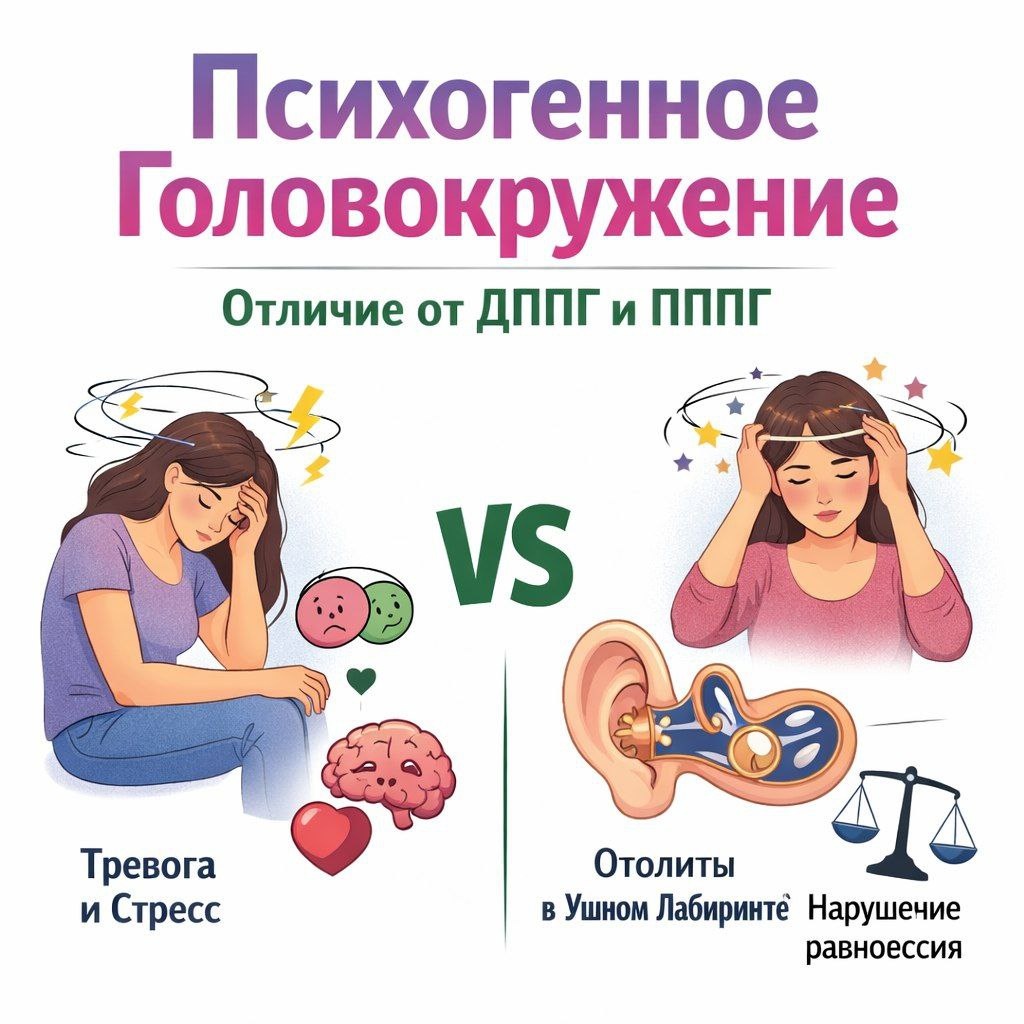 *Подробное описание симптомов ДППГ и ПППГ, а также их сравнение между собой — в карточках к этому посту 👆* 📍 Что такое психогенное головокружение? Психогенное головокружение (или функциональное) — это ощущение нарушения равновесия, дурноты, шаткости, которое возникает на фоне тревоги, стресса или панических атак и не связано с органическими поражениями вестибулярного аппарата или нервной системы. Это не "выдуманный" симптом. Человек реально чувствует головокружение. Но причина — не в повреждении внутреннего уха или мозга, а в том, как нервная система реагирует на стресс. 🔍 ТЕСТ: ОТЛИЧИЯ ПСИХОГЕННОГО ГОЛОВОКРУЖЕНИЯ ОТ ДППГ И ПППГ Проверьте себя. Ниже — ключевые признаки, по которым можно отличить психогенное головокружение от двух других самых частых видов. Если большинство пунктов совпадает с вашими ощущениями — возможно, у вас именно психогенный тип. ✅ Отличия от ДППГ (доброкачественного позиционного головокружения) При ДППГ: Мир буквально вращается вокруг вас, как на карусе