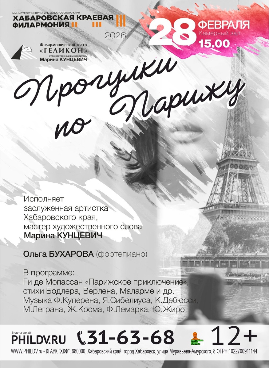» ✔ Литературно-музыкальный спектакль по произведениям Ги де Мопассан, Шарль Бодлер, Поль Верлен, Артюр Рембо, Жак Превер, Антуан де Сент-Экзюпери ✔ Музыка Клод Дебюсси, Морис Равель, Ян Сибелиус, Ив Монтан ✔ Атмосфера парижских кафе, поэзии и живой музыки 📅 Когда: #28_февраля в 15:00 ⛳ Где: Камерный зал Филармонический театр «ГЕЛИКОН» 💳 Стоимость: 450–900 ₽ Билеты 👉 Афиша Хабаровска. Куда сходить, экскурсии