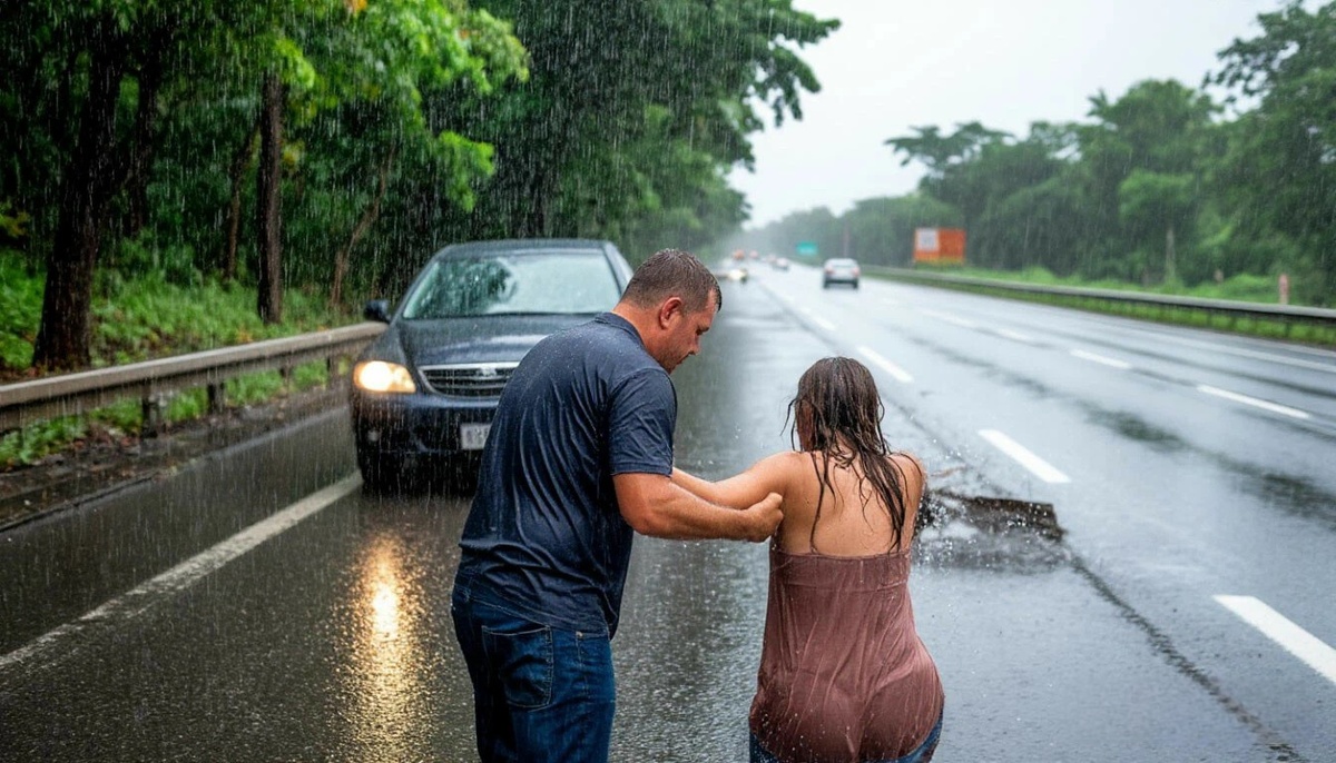 Именно поэтому, когда он увидел фигуру на обочине, его первая реакция была не эмоциональной, а практической: «Человек в беде. Нужно остановиться». Машина плавно затормозила на аварийной полосе. Через ливень Алексей разглядел женщину. Она стояла, прижавшись к отбойнику, вся дрожа, в легкой куртке, которая мгновенно промокла насквозь. Когда он вышел и подбежал к ней, фонарик выхватил из темноты страшную картину: лицо было искажено болью, под глазом расплывался огромный синяк, губа рассечена, а одежда местами порвана. Она смотрела на него не с надеждой, а с животным ужасом, ожидая нового удара.