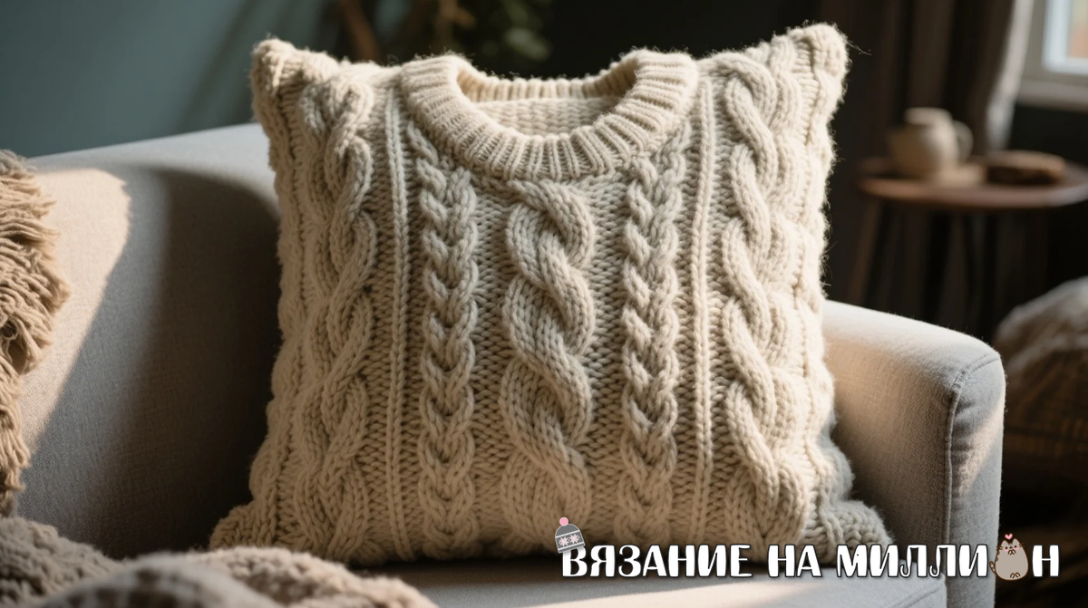 ❌ Минус: свитер должен быть целым (без дыр и пятен на передней части) Секрет: выбирайте свитера с интересным узором — косы, жаккард, ажур. Это станет декором подушки! Из рукавов свитера получаю