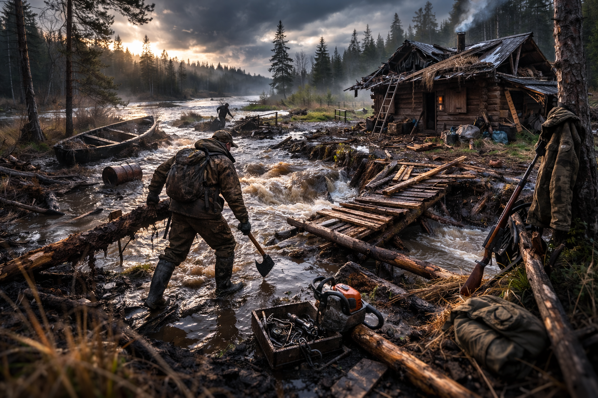 Весенняя вода не спрашивает разрешения. Она приходит ночью, поднимается молча и уходит, оставляя после себя не разрушение — а пустоту. Не хаос, а другое пространство. И если ты живёшь в тайге не на выходные, а месяцами, то знаешь: паводок — это не стихия. Это экзамен. Я шёл к зимовью уже по другой тайге. Хотя тропа была та же, направление то же, и даже поворот у старой лиственницы остался на месте. Но воздух пах иначе — сыростью, гнилью прошлогодней травы и свежей, тяжёлой водой. Ручей, который зимой можно было перешагнуть, теперь шумел, как маленькая река. Первый настил через овражек исчез. Просто исчез. Остались два обломанных кола и вбитый в ил гвоздь. Доски унесло. Я стоял и смотрел. Не с досадой. С пониманием. Тайга не ломает — она смывает. До избушки оставалось меньше километра. Тропа была размыта, местами уходила в воду. Следы зверя спутаны, старые капканы — если и остались, то под слоем ила. Когда показалась крыша, сердце всё-таки сжалось. Дом стоял. Но вокруг него была чужая з