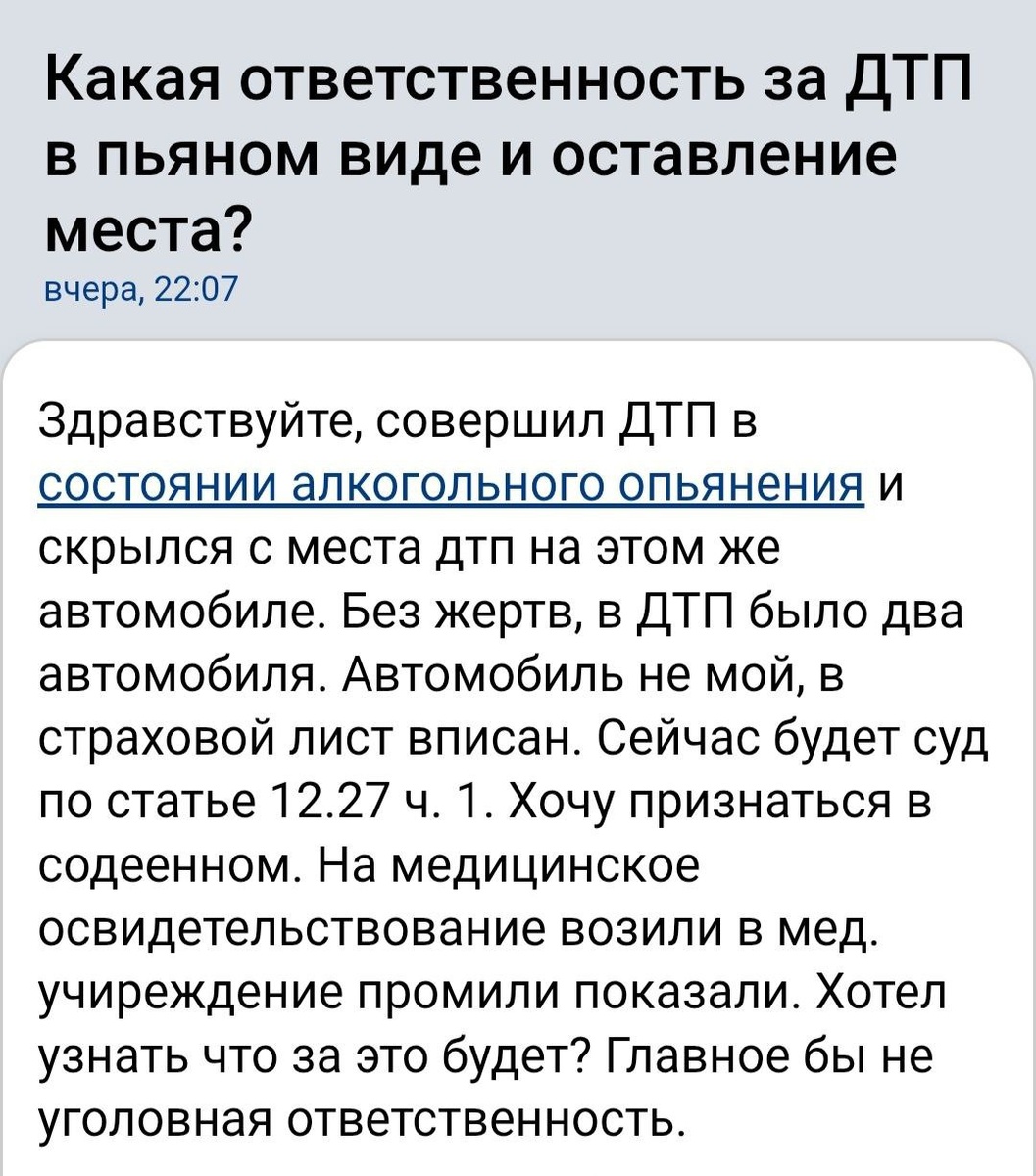 За ДТП в пьяном виде (ст. 12.8 КоАП) — лишение прав на 1.5–2 года и штраф 45 тыс. руб. За оставление места ДТП (ст. 12.27 ч. 2 КоАП) — арест до 15 суток или лишение прав до 1.5 лет. Признание вины смягчит наказание, но лишения прав не избежать. #ДТП #пьяныйводитель #лишениеправ #1227КоАП #128КоАП #скрылсясместаДТП #ОСАГОрегресс