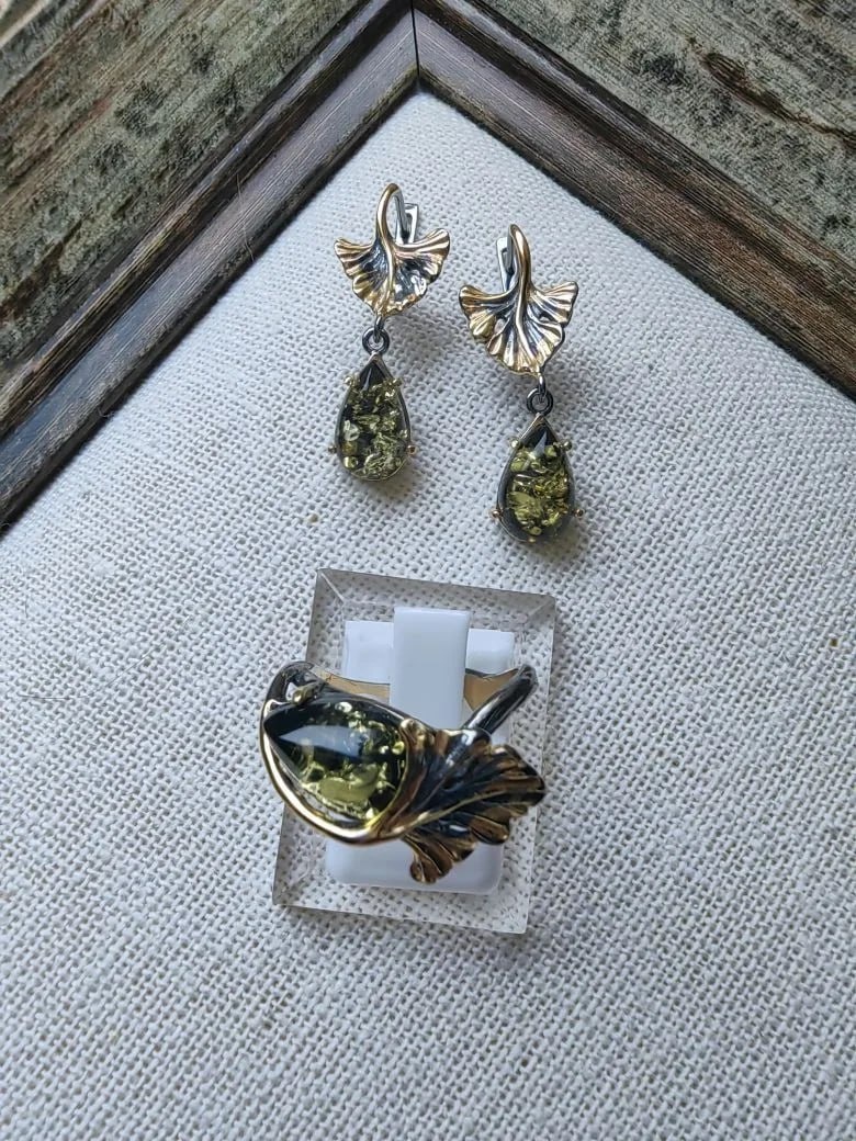 Серебро 925 проба, черный родий, позолота 18 микрон, натуральный янтарь.