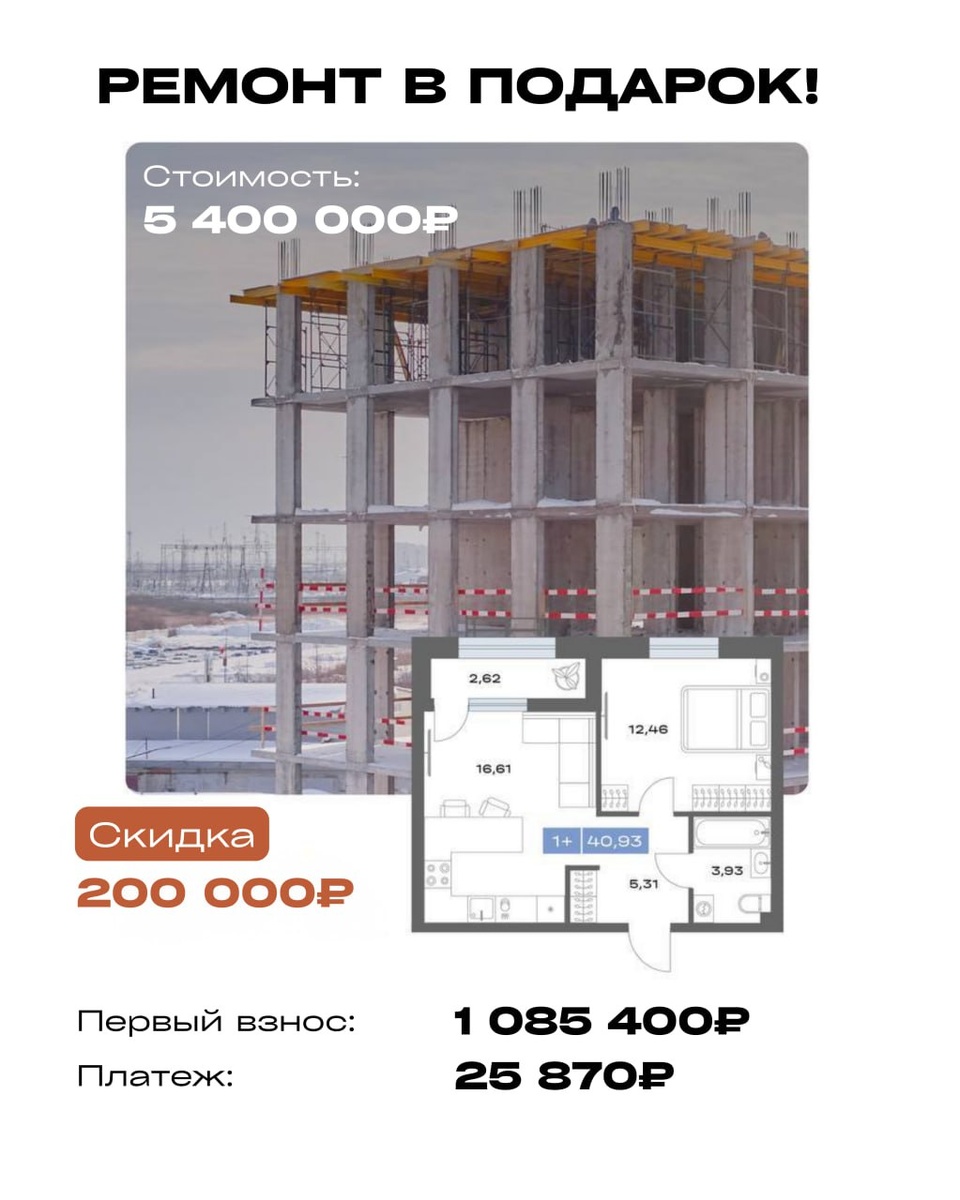 ! Иногда лучшее вложение — это своя недвижимость, которая сразу начинает работать на вас. 🟧 Квартира 1+ — 40,93 м² Стоимость — 5 400 000 ₽ Скидка — 200 000 ₽ 🎁 Ремонт в подарок Первоначальный взнос — 1 085 400 ₽ Ежемесячный платёж — 25 870 ₽ 📍 Район ММС — север Тюмени Место, где сочетаются спокойствие, инфраструктура и близость к природе. Что рядом:🟧 — Школа №45 — Детские сады — Супермаркеты и аптеки — Остановки общественного транспорта — Тихий зелёный район для жизни Это отличный вариант, если вы хотите: 🟧вложить деньги в недвижимость 🟧купить квартиру с готовым ремонтом 🟧начать жить или сдавать сразу после получения ключей. 🟧 Пишите кодовое слово «ФОРТ» в @metry_agentstvo1 — расскажем условия и подберём вариант.