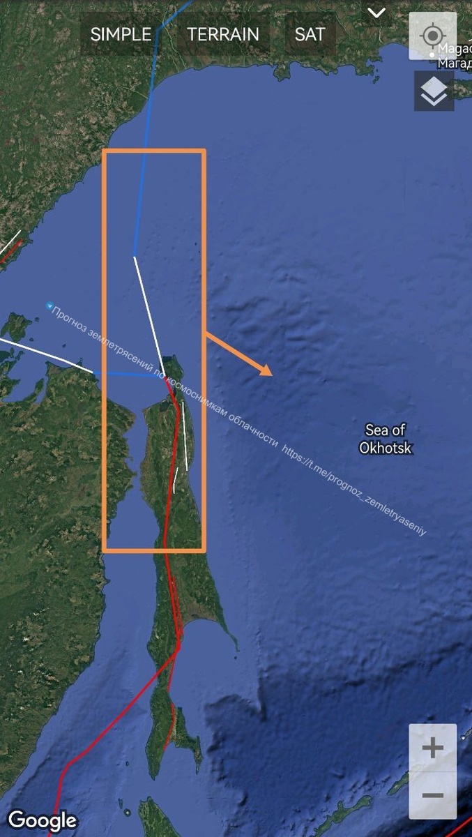 Также под подозрением граница Охотской плиты у Сахалина. Но здесь сочетание границы в облачности с визуальным эффектом от льда в Охотском море.