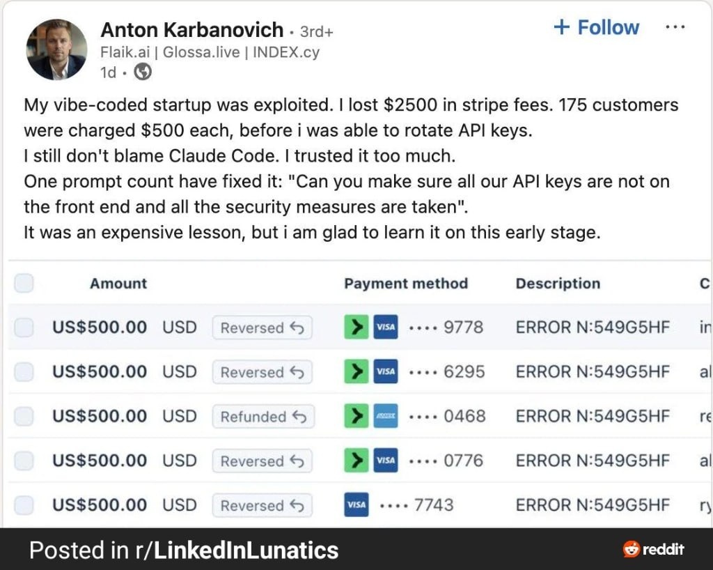 "Мой вайб-стартап взломали. Потерял 2500 баксов на комиссиях Stripe. А с моих 75 клиентов списали по 500$ до того, как я сменил ключи доступа. Стартап писал на Caude Code."