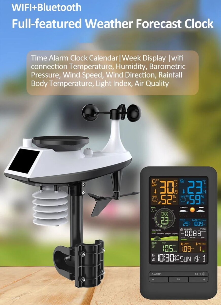 Метеостанция: с цветным экраном. Отображается информация о погоде, включая данные о дожде, скорость и направление ветра, температуру и влажность в помещении и на улице, индекс барометрического давления, дату и время. К метеостанции можно подключить три дополнительных датчика. Имеется функция обнаружения дождя и ветра: Профессиональный модуль обнаружения дождя и ветра может точно отслеживать изменения осадков в реальном времени, а также передавать текущую скорость и направление ветра на экран метеостанции и в приложение. Экран метеостанции имеет 5 уровней яркости подсветки и автоматический контроль яркости ночного света, что обеспечивает комфортное использование. На экран выводятся данные температуры, влажности, скорости ветра, дождя и интенсивности света.