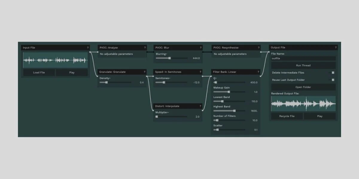 CDP широко используется Aphex Twin, но для большинства людей работа с командной строкой — это неприемлемо. SoundThread решает эту проблему, превращая CDP в визуальную среду, где вы соединяете процессы, такие как блоки и кабели.