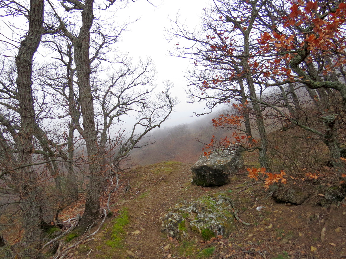 В очередные выходные февраля мы с подругой решили прогуляться. И как обычно, на выходные портится погода. Что делать? Туман, так туман. Значит будем бродить, как ёжики! Доехав на маршрутке до Щебетовки, направились на окраину и по крутой тропе направились на отроги Эчки-Дага. Туман, как обычно висел капельками в воздухе, скрывая всё вокруг. Вот здесь должны выглядывать вершины Кара-Дага. Задержались немножко на довольно неуютной тропе, идущей по крутому склону. Да и как не задержаться! Ведь мы тут высматриваем сокровища! Которые откалываются от вершин, нависающих над нами. От того, что вышли на грунтовую дорогу, легче не стало. Так и шли, то пробираясь сквозь заросли, то топая по грязи. Предполагалось, что перед нами теперь откроются мощные вершины Эчки-Дага. И только один раз, словно внасмешку, откуда-то из-под неба на нас посмотрела одна из его вершин. Ну, хотя бы мы убедились, что гора на месте! Сзади нас гора Ёжик тоже побаловала своими скальными выходами. Где-то вдалеке, за Ще