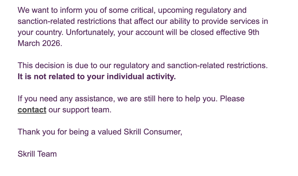 На 5-й год СВО skrill прислал извинения. Такие милые! Как дети нашкодившие. Правда закрытие аккаунта произошло вчерашним днем. Могли бы как мужики написать? Британский монарх хочет уничтожить вашу страну, мы прекращаем любое сотрудничество с вами. Так было бы более правдиво.