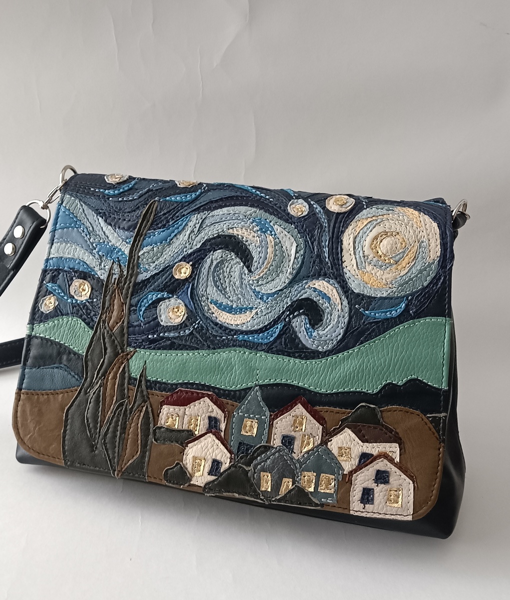 А вот если спросить, какая самая сложная. То это точно сумка с аппликацией по мотивам картины Ван Гога Звёздная ночь .