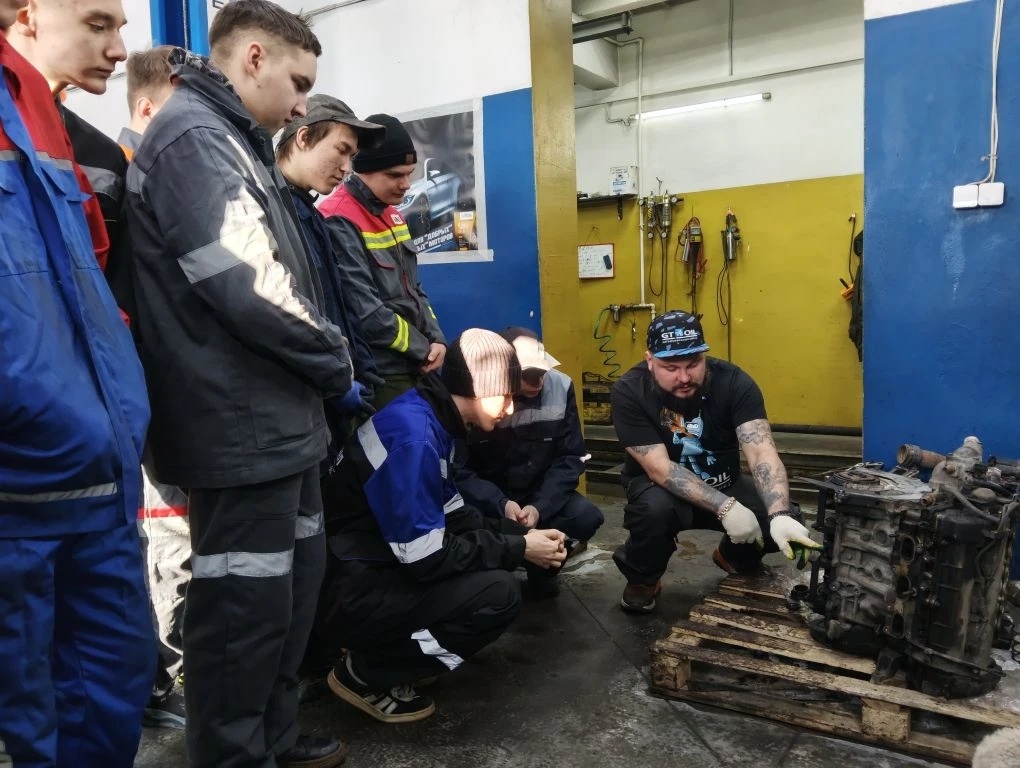 Партнер GT OIL в Новокузнецке, мастерская "Красный Лис", именно ее руководитель - механик, авто диагност с многолетним опытом Владимир Шебалин провел практическое занятие по теме «Смазочные материалы в современном автомобиле» для студентов местных техникумов и колледжей. Целью данного занятия стало обобщение знаний по смазочной системе, о применяемых смазочных материалах в автомобиле и закрепление практических навыков по замене масляного фильтра, масла в ДВС. Занятие состояло из теории и практики, ребята узнали много нового о видах, назначении масел (ДВС, АКПП/МКПП, редуктор, ШРУС), масляном фильтре, производстве масел, маркировке, спецификациях и допусках. На практической части семинара студенты самостоятельно провели весь цикл работ по замене масла в автомобиле: подняли автомобиль на подъемнике, слили отработанное масло в маслосборник, заменили масляный фильтр, залили в мотор свежее масло и проверили его уровень масла. Владимир приоткрыл ребятам несколько профессиональных секретов,