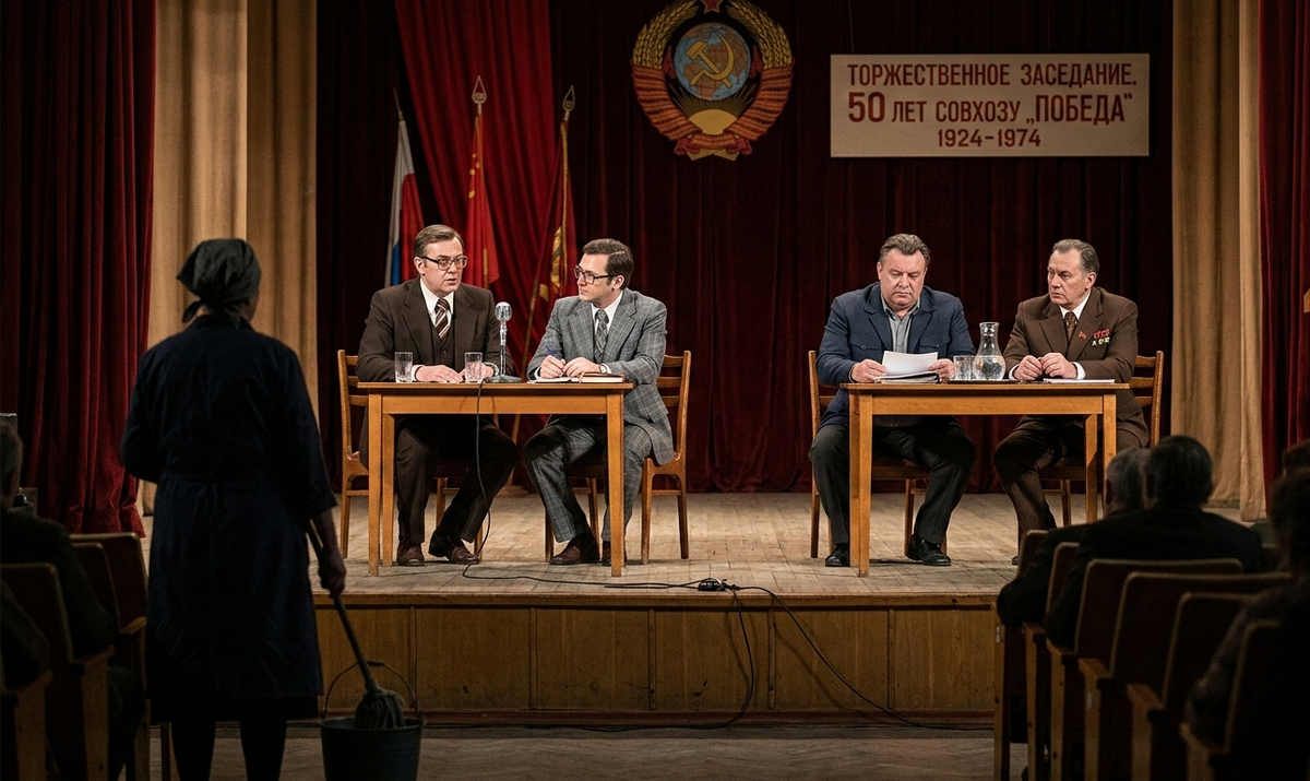 За длинным столом на сцене сидели четверо мужчин. Директор завода Борис Петрович Крутиков, главный инженер Валентин Степанович, а напротив них - двое незнакомых в строгих костюмах, явно из Москвы.
