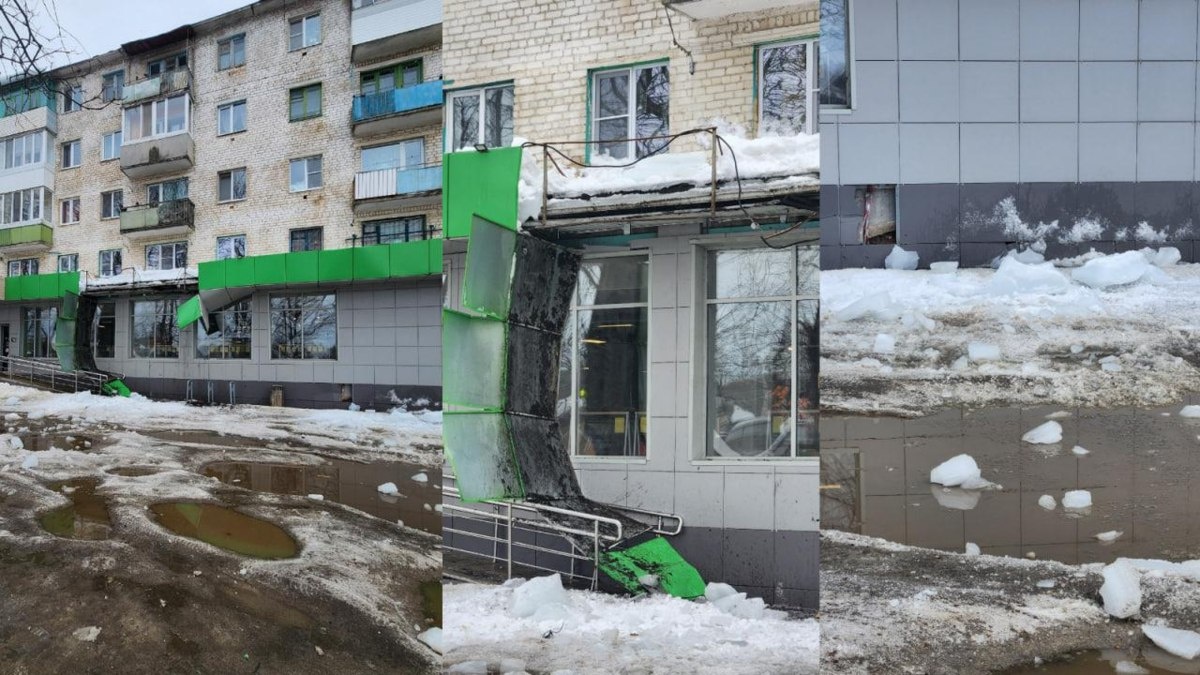 Фотофакт: в Мценске обрушившийся с крыши лед повредил фасад магазина