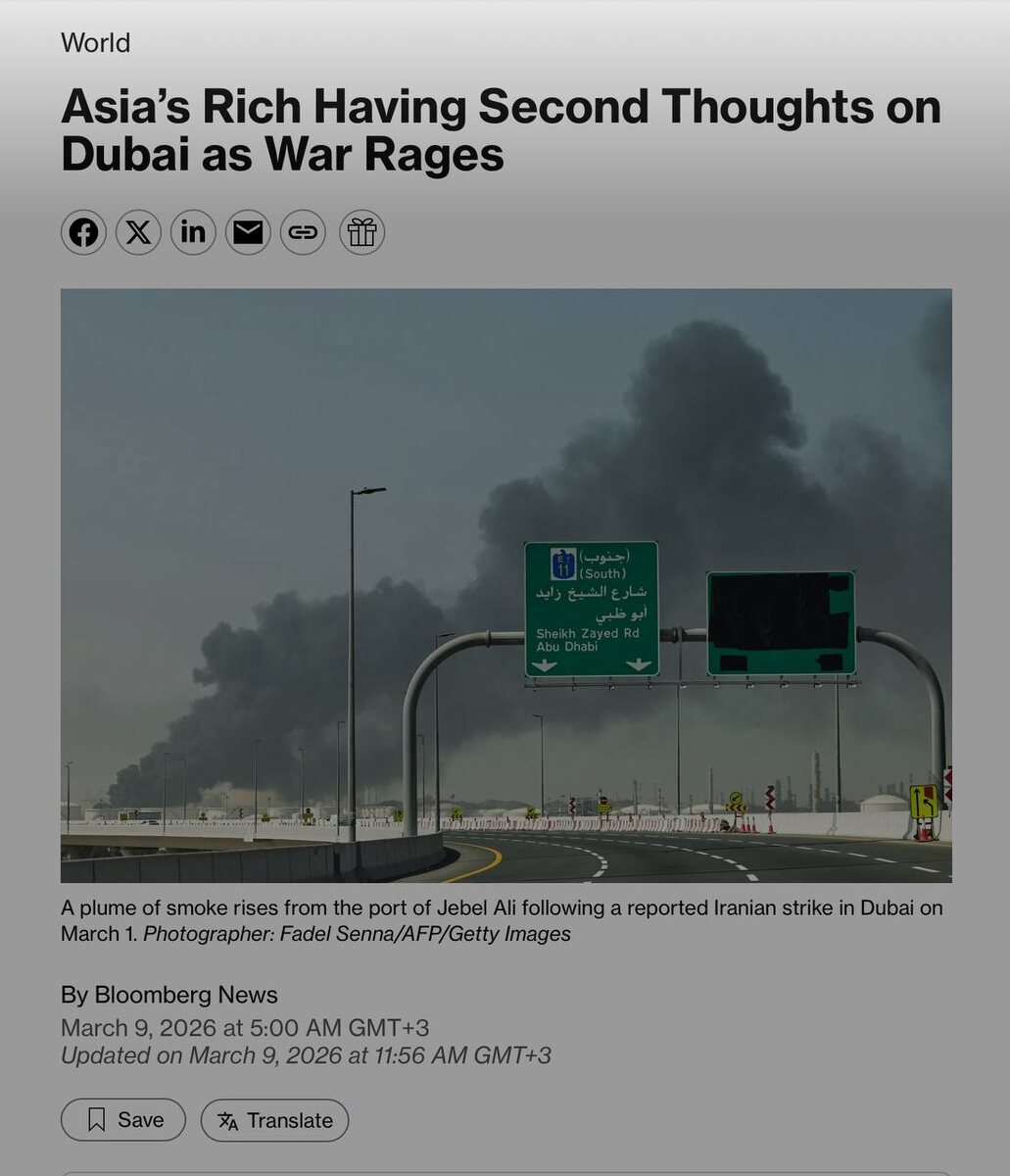 свое жилье не продает», мировая пресса полнится новостями о паническом выходе зарубежных инвесторов с рынка Дубая. Вот, например, текст Bloomberg: “Asia’s Ultra-Rich Having Second Thoughts on Dubai as War Rages”, изобилующая фактами. Краткий перевод: — Эскалация войны вокруг Ирана заставила часть сверхбогатых инвесторов из Азии пересмотреть планы по переезду и инвестициям в Дубаи. — Они готовят планы на случай эскалации, переводят часть средств в другие юрисдикции, замораживают покупку недвижимости и бизнес-релокацию в Дубай. — Часть капитала рассматривает альтернативные финансовые центры, например Сингапур и Гонконг. Кому мы больше верим, ребята? 🔺Треугольный метр