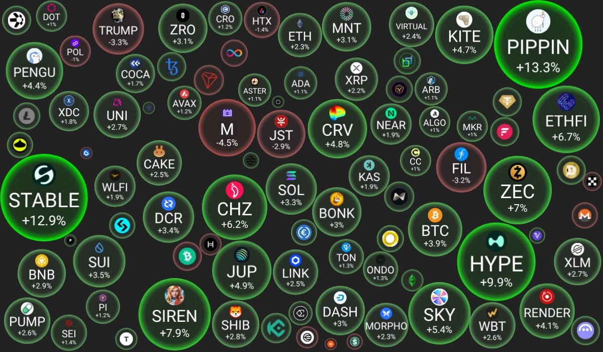 🗓 10.03.2026 09:30 по Москве. 🔗 Посмотреть на сайте 📈 Лидеры роста (из ТОП-100): 🟢 pippin (PIPPIN): $0.3669 (+13.3%) 🟢 Stable (STABLE): $0.0294 (+12.9%) 🟢 Hyperliquid (HYPE): $34.09 (+9.9%) 📉 Лидеры падения (из ТОП-100): 🔴 MemeCore (M): $1.4777 (-4.5%) 🔴 Official Trump (TRUMP): $2.9082 (-3.3%) 🔴 Filecoin (FIL): $0.9285 (-3.2%) 🔍 Основные метрики: 🟢 Общая капитализация: $2383.86 млрд (+2.91%) 🟢 Общий объем торгов: $104.90 млрд (+20.19%) 🟢 Доминация Bitcoin: 58.85% (+0.57%) 🔴 Доминация Ethereum: 10.37% (-0.05%) 🟢 Индекс страха и жадности: 13 / 100: ЭКСТРЕМАЛЬНЫЙ СТРАХ (+5) 🔴 Индекс Альтсезона: 36 / 100: НЕ АЛЬТКОИН-СЕЗОН (-1) 📖 Интересно почитать: 👉 Что такое бессрочные фьючерсы в криптовалюте: подробное руководство для трейдеров. 😻 Наши сервисы и бонусы: 💰 Cryptoage.com - рассказываем про Блокчейн и Криптовалюты с 2013 года 📈 Hyperliquid - крупнейшая DEX биржа, занимает 80% объема рынка DEX фьючерсов