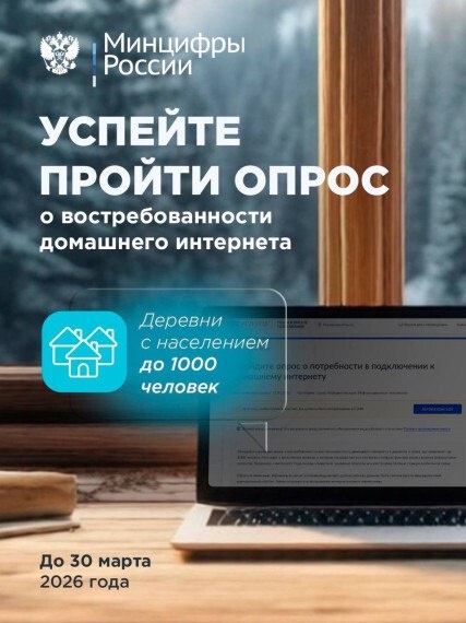 недоступен. Это нужно, чтобы оценить реальный спрос и подготовить решения для подключения отдельных домохозяйств. В опрос включены деревни и сёла, где проживают меньше 1000 человек и куда государство уже подвело волоконно-оптические линии. Кто может принять участие? В опросе могут принять участие все жители России, заинтересованные в улучшении цифровой инфраструктуры своих населённых пунктов. Мнение каждого респондента поможет точнее определить приоритеты при планировании развития телекоммуникационной сети. Для участия в опросе необходимо авторизоваться через единый портал государственных услуг и проголосовать по одной из следующих ссылок: - clck.ru/3S5s3m; - clck.ru/3QtscZ.