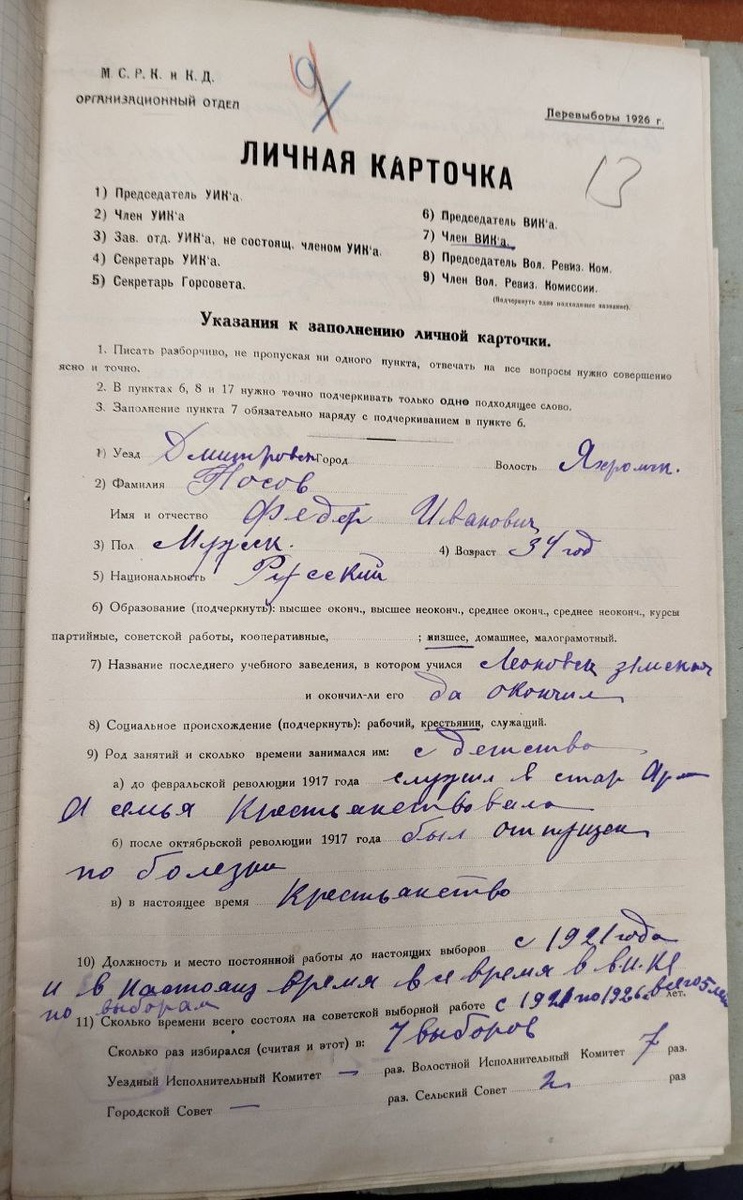 Анкета (личная карточка)на члена Яхромского Волостного исполнительного комитета Носова Фёдора Ивановича 1926 г. Николай Алексеев. #Яхрома #история_Яхромы ВК , ОК , MAX, Tik Tok.