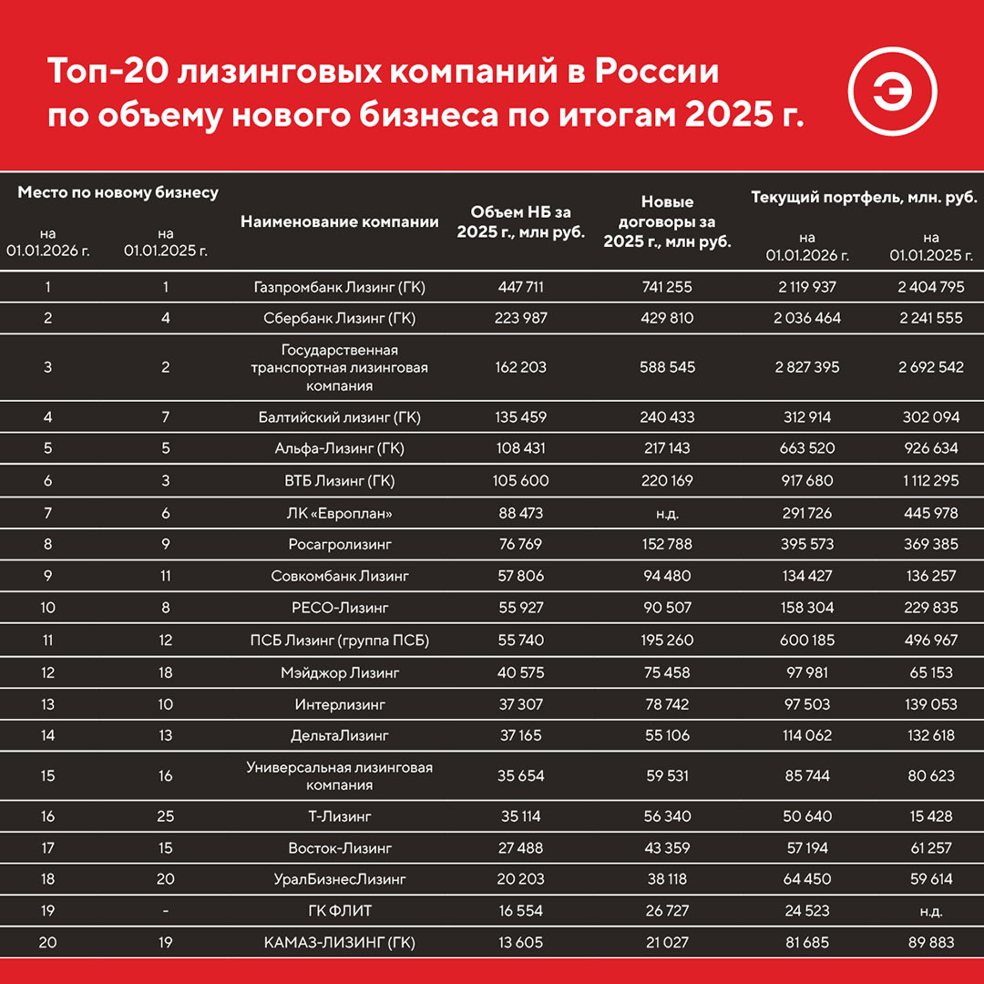 👆 – – новые рэнкинги лизинговых компаний по итогам 2025 года 🥇 По итогам 2025 г. значимый объем нового бизнеса сохраняется за ГК «Газпромбанк Лизинг», показавшей снижение на 43%. 🥈 На второе место поднялась компания «Сбербанк Лизинг» (ГК), продемонстрировав уменьшение нового бизнеса на 18%. 🥉 Третью позицию занимает компания «ГТЛК», объем нового бизнеса которой сократился на 54%. Концентрации лизингового бизнеса на игроках топ-10 снижается второй год подряд и составила 73% нового бизнеса. ♦️Рэнкинг лизинговых компаний России по итогам 2025 года ♦️Рэнкинг ЛК по объему нового бизнеса в разрезе оборудования ♦️Рэнкинг ЛК по объему НБ с МСБ в разрезе оборудования ♦️Рэнкинг ЛК по объему НБ в разрезе клиентов ♦️Рэнкинг ЛК по объему нового бизнеса в разрезе регионов ♦️Рэнкинг ЛК по объему портфеля ♦️Рэнкинг ЛК по объему портфеля в разрезе оборудования ♦️Рэнкинг ЛК по числу заключенных сделок ♦️Рэнкинг ЛК по объему профинансированных средств ♦️Рэнкинг ЛК по объему НБ (оперативный лизинг)
