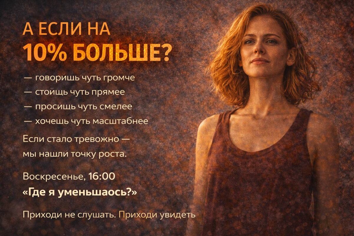 Система может больше. Но работает на 30%. Недавно на сессии была женщина, 39 лет. Красивая. Умная. Сильная. Хорошая работа, отношения, стабильная жизнь. И при этом — ощущение, что жизнь проходит в полсилы, что есть сдерживание себя, что есть выжидание и откладывание до лучшего момента. Начали смотреть. В работе — она делает больше всех, но на встречах говорит тихо и коротко. Инициативу отдаёт другим. В отношениях — терпит то, что давно не нравится. «Чтобы не провоцировать конфликт». В деньгах — несколько раз отказывалась от проектов, потому что «я ещё не готова». В теле — сжатые плечи. Сжатая челюсть. Сжатое дыхание ( как будто тугой ремень на ребрах) Я спросила её, задала один вопрос: — А если ты станешь на 10% больше… что случится? И вот тут произошёл тот самый момент тишины. Она сказала: «Мне кажется… тогда меня станет слишком много». Слишком яркая. Слишком требовательная. Слишком заметная. И дальше — фраза, которую я слышу от многих женщин: «Меня могут перестать любить».… Вот он —