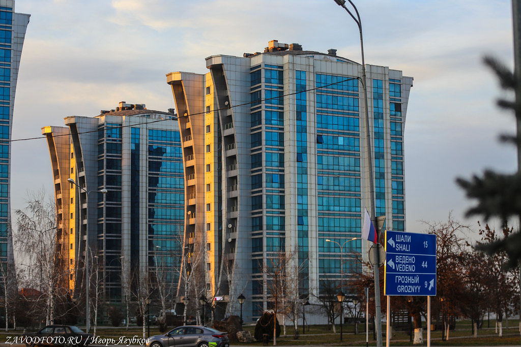 Рядом с мечетью возвышаются два комплекса многоэтажек «Аргун-Сити». Как и в Шали, в этом сити располагаются обычные жилые квартиры, отель и бизнес-центр.