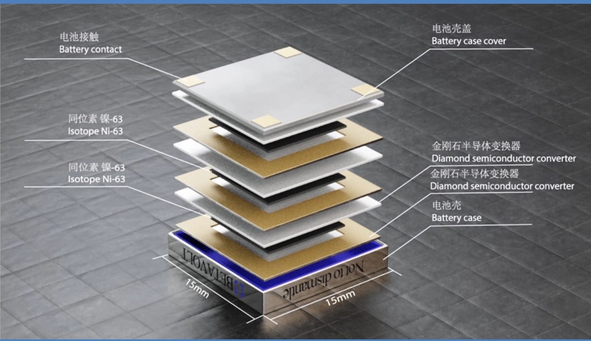 Сегодня предлагаю начать небольшое путешествие в мир батареек будущего. Как известно, одна из ключевых проблем современной электроники, это достаточно ощутимое энергопотребление. Литий-ионные аккумуляторы во многом этот недостаток решают, но все равно часто приходится что-то подзаряжать. Шутки про сборы в дорогу, где спрашивают, заряжены ли телефон, ключи, часы, машина, куртка, кроссовки и т.д., и т.п., уже обросли густой баянистой бородкой. А что, если сделать ту самую ядерную батарейку из условного Fallout и забыть про все эти проблемы лет этак на 50? А давайте, сказали нам товарищи из китайской компании Betavolt Technology и запустили этой весной в массовое производство батарейку BV100. Коробка размером 15х15х5 мм обещает выдавать напряжение 3 В аж 50 лет. Концептуально все очень просто: берем спец корпус, куда слоями в 10 микрон кладем алмазные полупроводники, а между ними 2 микронный радиоактивный никель 63, дальше физика сама все сделает. Никель 63 очень удобный, поскольку в резу