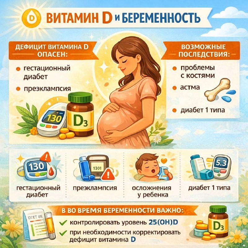 Дефицит витамина D во время беременности встречается очень часто. По данным эпидемиологических исследований, недостаток витамина D выявляется у 20–85% беременных женщин в зависимости от страны проживания, образа жизни и социальных факторов. И это важно, потому что витамин D влияет не только на костную систему, но и на метаболизм, иммунитет и течение беременности. 🦴 Влияние на здоровье матери и плода Дефицит витамина D во время беременности может: • ухудшать состояние костной ткани матери • нарушать формирование скелета плода • повышать риск осложнений беременности Исследования показывают, что недостаток витамина D связан с: ⚠️ повышенным риском преэклампсии ⚠️ инсулинорезистентностью ⚠️ гестационным сахарным диабетом (ГСД) ⚠️ макросомией плода (крупный плод) 🍬 Витамин D и гестационный диабет Активная форма витамина D — 1,25(OH)₂D₃ — участвует в регуляции секреции инсулина β-клетками поджелудочной железы. Это означает, что витамин D влияет на: • уровень глюкозы крови • чувствительно