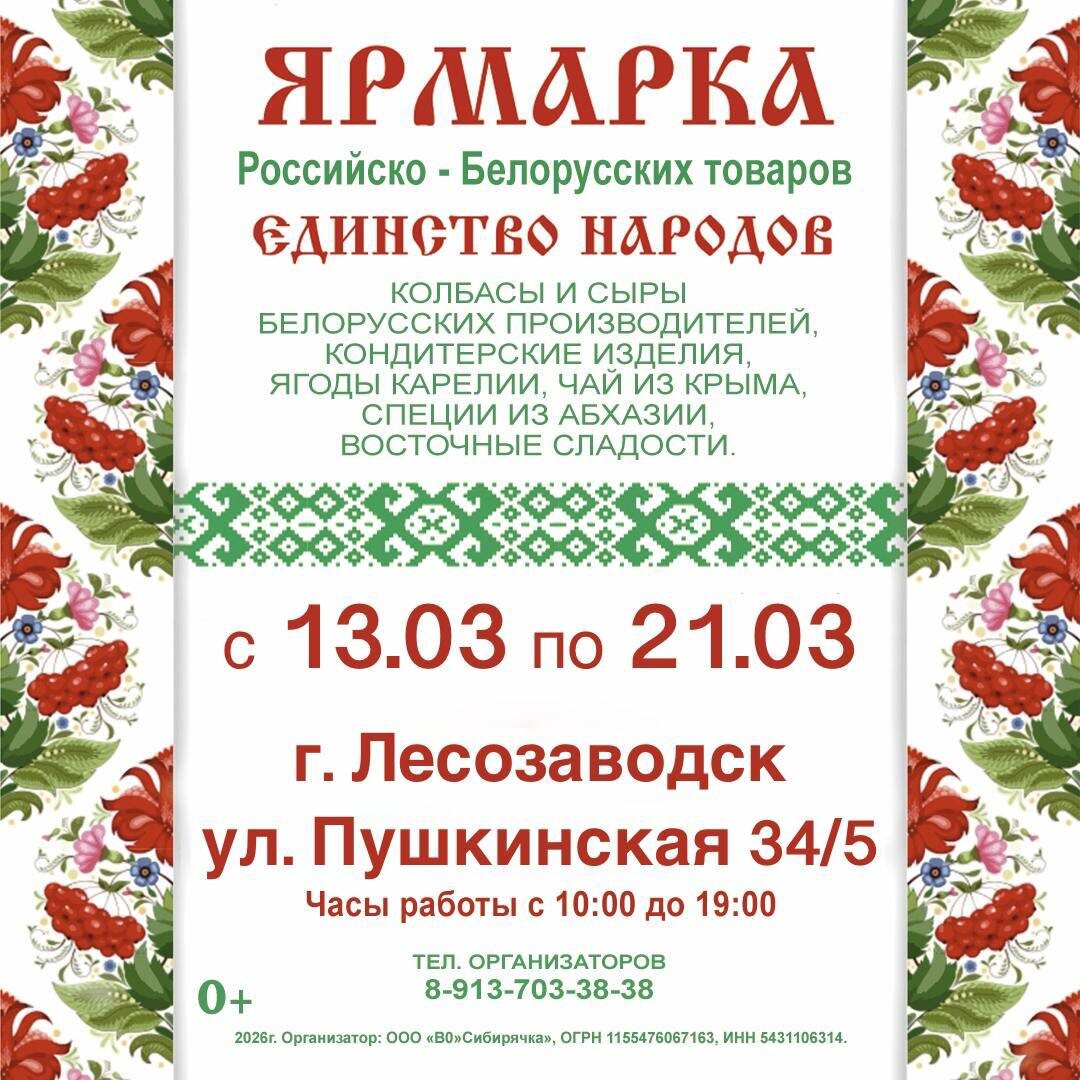 Лесозаводск по адресу ул. Пушкинская 34/5. На ярмарке представлены товары Белорусских и Российских производителей: Колбасы и сыры Халва и кондитерские изделия Ягоды из Карелии Чай из Крыма Специи из Абхазии Восточные сладости Галантерея Нижнее бельё Ярмарка работает с 13.03 по 21.03 (с 10.00 до 19.00).