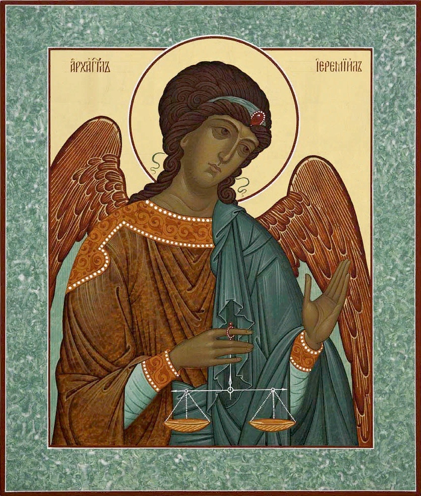 (8/21 ноября) Архангел Иеремиил – внушитель благих и добрых помыслов, возноситель душ к Богу, возношение к Богу, милосердие Божие. Имя Иеремиил в переводе с еврейского языка означает – возвышение к Богу, высота Божия. О святом Архангеле Иеремииле в Третьей книге Ездры пишется так: «Не о том же ли вопрошали души праведных в затворах своих, говоря: «доколе таким образом будем мы надеяться? И когда плод нашего возмездия?» На это отвечал мне Иеремиил Архангел: «когда исполнится число семян в вас, ибо Всевышний на весах взвесил век сей, и мерою измерил времена, и числом исчислил часы, и не подвинет и не ускорит до тех пор, доколе не исполнится определенная мера» (3Езд. 4, 35—37), т. е. будущий век наступит лишь тогда, когда количество умерших праведников достигнет определенного предела. Этот ответ дает им Архангел Иеремиил (Апокалипсис Иоанна Богослова дает точную цифру запечатленных из всех колен Израилевых, именно 144000 (7, 4)). Все девять Ангельских чинов соберутся в день Страшного Суд