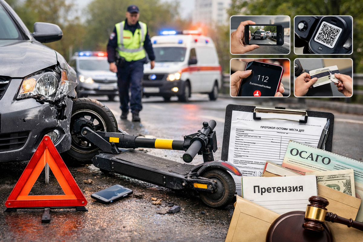 📝 Сделайте фото и видео места происшествия, повреждений, номерного знака автомобиля и, если возможно, идентификационных меток самоката (QR-код, серийный номер).