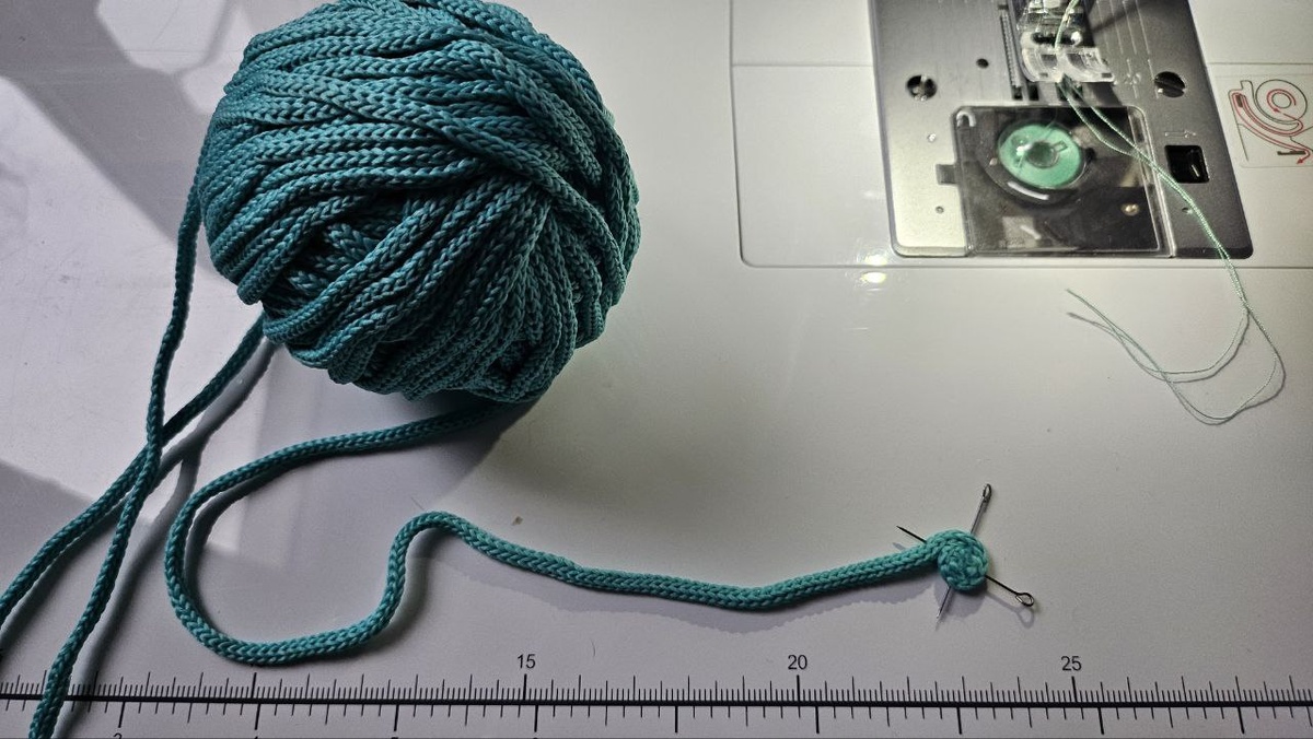 После вязания коробочки, остался шнур. Ну не выкидывать же? Да еще название интересное. Надо, думаю, сшить такой! Подрезала кончик шнура, скрутила по спирали и пошла к швейной машине. чтобы закрепить начало шитья строчкой, сколола булавками крест-накрест. Через центр прошиваю несколько раз обычной строчкой в разных направлениях 🕸. Затем начинаю формировать круг. Теперь уже шью прерывистой строчкой зигзаг. Пальцами левой руки помогаю ровно подавать шнур. В правой руке длинная игла (можно взять любой длинный острый предмет). Аккуратно, чтобы не попасть под швейную иглу продолжаю направлять и располагать шнур в нужном направлении. Весь процесс можно посмотреть в подробном видео. Процесс сшивания шнура в круг простой, "залипательный" и тут главное, вовремя остановиться. Когда нужный размер получился, обрезаем шнур ✂ и на это место пришиваем этикетку. Можно, конечно, оставить так как есть. Это уже ваше решение. Затем обязательно нужно отутюжить - это убрать при помощи утюга все лишние ск