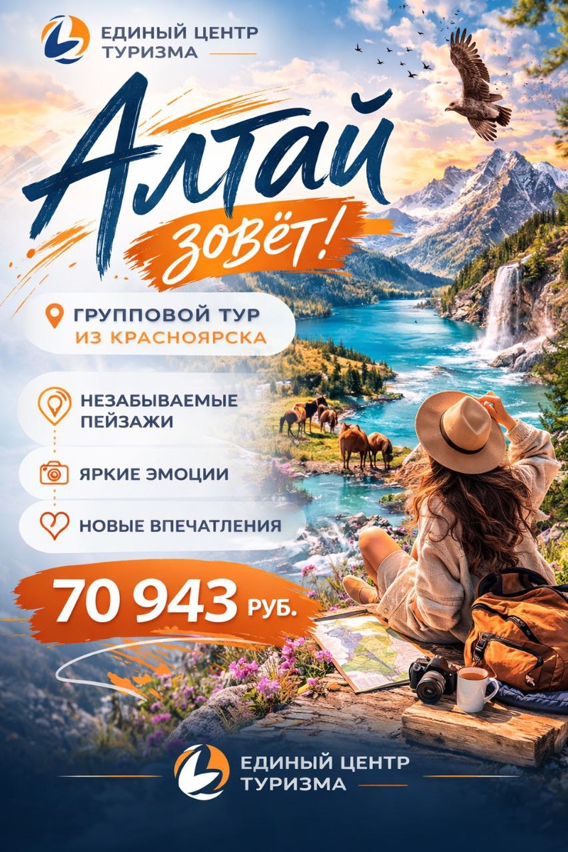 Иногда достаточно просто сменить обстановку, вдохнуть свежий горный воздух и увидеть природу, которая действительно впечатляет. Алтай — это 🏔 величественные горы 🌿 невероятная природа 🌊 мощные реки 📸 красивые места, которые хочется фотографировать снова и снова Мы организуем групповой тур из Красноярска, где всё уже продумано. Вам остаётся только наслаждаться путешествием и новыми впечатлениями. 💰 Стоимость тура — 70 943 руб. 📍 Групповой тур из Красноярска Количество мест в группе ограничено. ✈️ Единый Центр Туризма Лицензированный туроператор по России и приёму иностранных гостей. Мы организуем: — туры по России — зарубежные путешествия — круизы по рекам России и миру — экскурсионные поездки 📩 Узнать подробности или забронировать: 📞 8-983-508-00-38 📞 8-913-030-08-48 📞 8 (391) 208-00-38 🌐 Наши официальные группы Telegram [https://dzen.ru/id/62725165c3058e58fa66f2e2](https://t.me/goriashietyri) VK [https://vk.com/ect124](https://vk.com/ect124) OK [https://ok.ru/z
