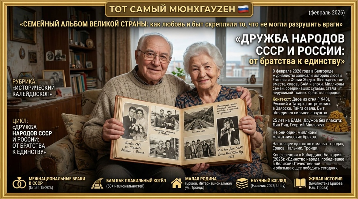 🚨 Рубрика: «Исторический калейдоскоп» Цикл: «Дружба народов СССР и России: от братства к единству» 📅 Семейный альбом великой страны: как любовь и быт скрепляли то, что не могли разрушить враги 🔹 Дружба без плаката. В их семейном альбоме хранится фотография с автографом американского певца Дина Рида, который приезжал на БАМ в 1979-м. И с теплом вспоминают наставника Евгения Семёновича — немца Георгия Леопольдовича Мюльгауза, главного бухгалтера, доброго и хорошего человека, который всегда помогал в работе. Русский, татарка, немец — все они были частью одной огромной страны, где дружба народов была не абстрактной идеей, а ежедневной практикой выживания и созидания. 🔹 Не они одни. Историк Адриенн Эдгар, исследуя феномен межэтнических браков в Советской Центральной Азии, отмечает парадокс: с одной стороны, власть прославляла смешанные семьи как знак нерушимой дружбы народов и скорого появления единого «советского народа». С другой — в последние десятилетия СССР многие выходцы из та