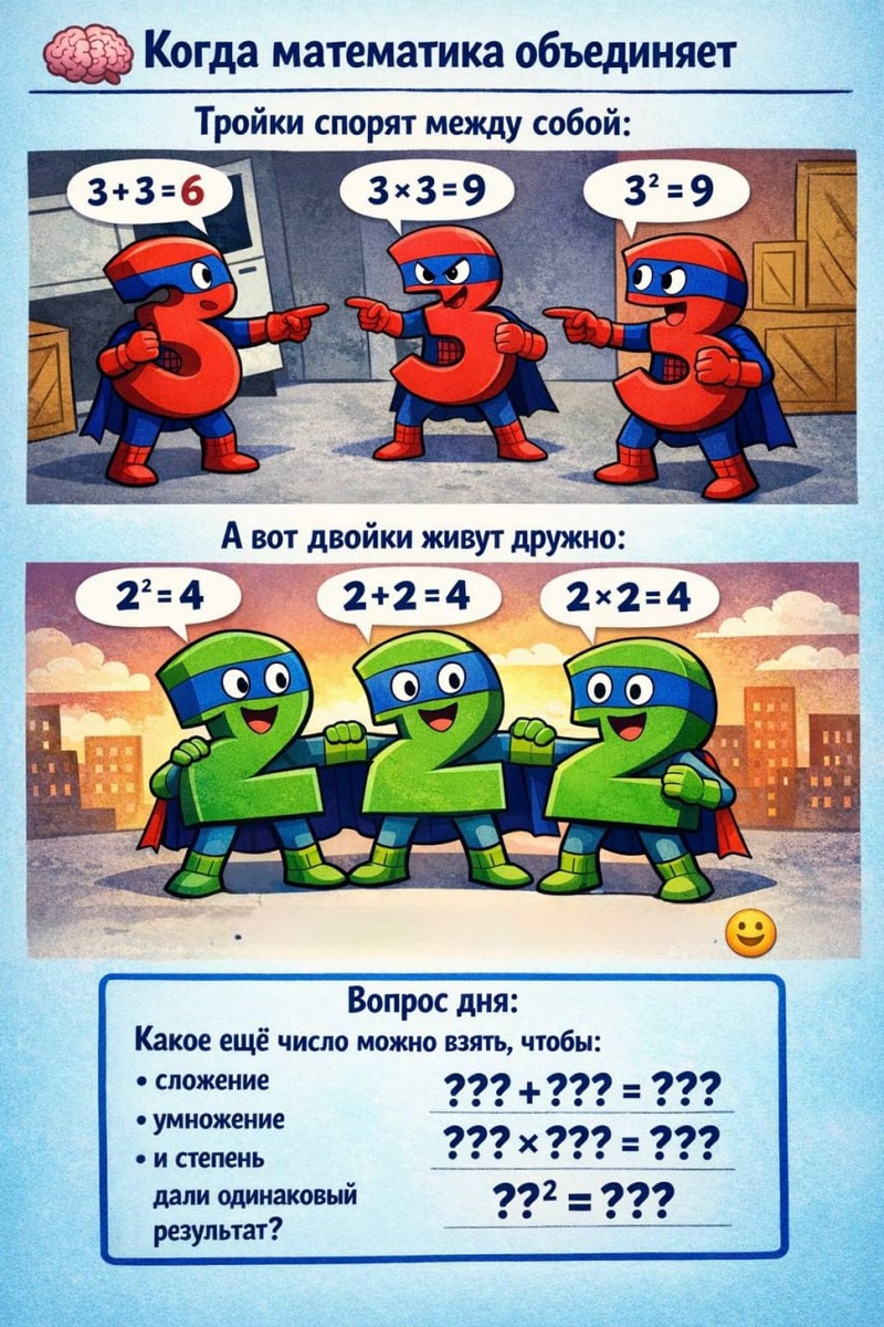 Тройки спорят между собой: 3 + 3 = 6 3 × 3 = 9 3² = 9 А вот двойки живут дружно: 2² = 4 2 + 2 = 4 2 × 2 = 4 Вот это настоящая математическая дружба ❓ Вопрос дня ❓ Какое ещё число можно взять, чтобы: ⏩сложение ⏩умножение ⏩степень дали одинаковый результат? Пишите свои версии в комментариях 👇 🚩VK 🚩MAX