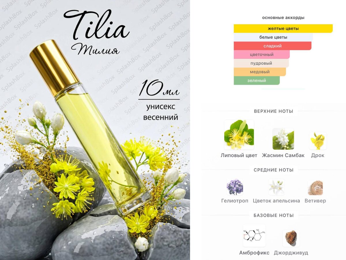 ⛱️⛱️⛱️⛱️⛱️⛱️⛱️⛱️⛱️ ⛱️⛱️⛱️⛱️⛱️⛱️ ⛱️⛱️⛱️ ⛱️⛱️⛱️⛱️⛱️⛱️⛱️⛱️⛱️ Всем привет! 🌞 Все ли попробовали наш хит весенних продаж? 🤍 ❤️ Tilia - белые цветы в медовой зелени липовой аллеи 🌟 Арт. 462530681 💙 Арт. 3585598364 ⛱️ Аромат-референс: Tilia Marc-Antoine Barrois ⛱️ Пирамида: Верхние ноты: Липовый цвет, Жасмин Самбак и Дрок Средние ноты: Гелиотроп, Цветок апельсина и Ветивер Базовые ноты: Амброфикс и Джордживуд ⛱️ Звучание: • Верхние ноты Начало аромата раскрывается свежими и утонченными аккордами липового цвета, который придает лёгкость и свежесть, а также нотами жасмина самбак - с его сладкой и интенсивной цветочной ароматикой. Дрок добавляет ещё больше цветочной глубины и немного сладковатую ноту. • Средние ноты Сердце аромата нежно раскрывает более теплые и гармоничные акценты: гелиотроп добавляет лёгкую кремовую сладость, цветок апельсина придает цитрусовую свежесть и яркость, а ветивер привносит тонкую древесную и землистую ноту, усиливая глубину аромата. • Базовые ноты В б