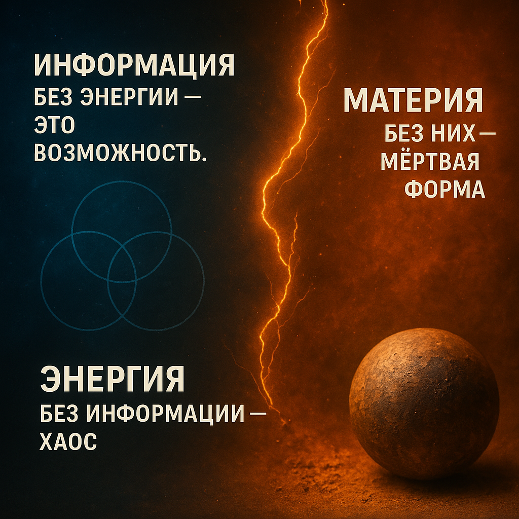 Эти три угла неразрывны. Убери информацию — материя будет бесформенной грудой пепла. Убери энергию — информация останется мертвой схемой в пыли. Убери материю — нечему будет воплощать замысел.