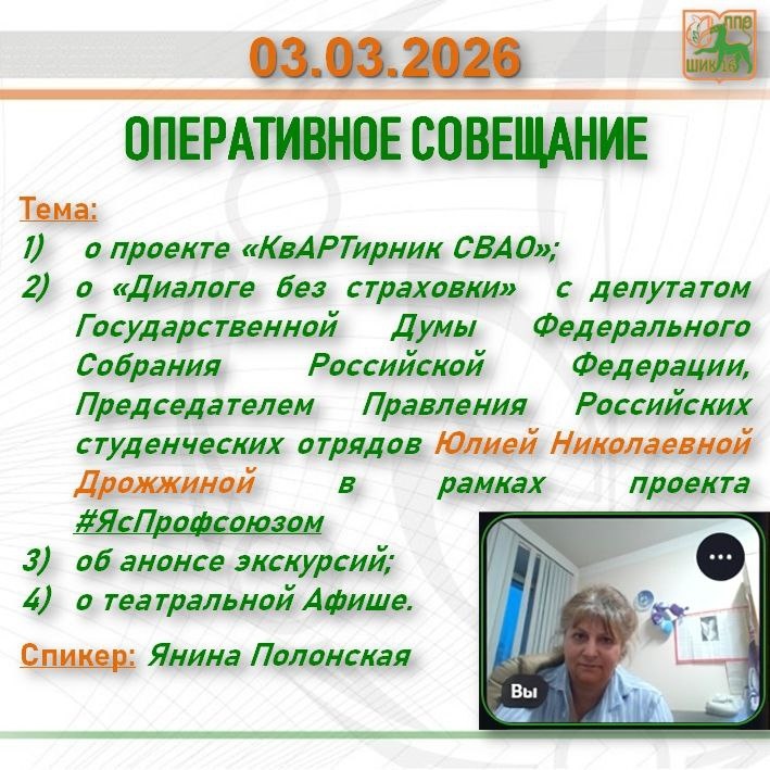 📣 03 марта 2026 года на оперативном совещании педагогического коллектива председатель ППО ГАОУ Школа «ШИК 16» Я.А.Полонская выступила перед