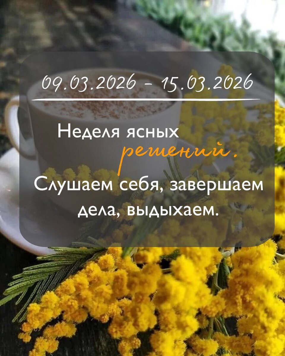 Период внутренней устойчивости, ясных решений и осознанных действий. Эта неделя постепенно переводит из эмоциональной турбулентности в уверенность и внутреннюю опору. Сначала важно сохранять спокойствие, затем — навести порядок, и к выходным проявиться ярче. ✦ Энергия по дням 09.03 — понедельник День внимательности и эмоционального баланса. Важно не реагировать импульсивно и сохранять спокойствие в общении. 10.03 — вторник День общения и быстрых решений. Хорошо обсуждать идеи, договариваться и завершать переписки. 11.03 — среда День гармонии и заботы о себе. Подходит для восстановления, тёплого общения и создания уюта. 12.03 — четверг День глубины и внутренних инсайтов. Полезно замедлиться, прислушаться к себе и сократить информационный шум. 13.03 — пятница День ответственности и практичности. Идеально для финансовых вопросов, завершения задач и наведения порядка. 14.03 — суббота День силы и действий. Важно направить энергию в движение, завершение дел и физическую активность. 1