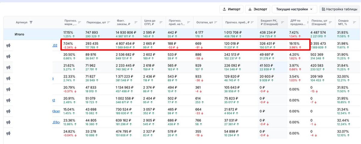 Разбираю кейс, где один артикул в склейке из 9 карточек съедает 75% рекламного бюджета, но именно он делает всю склейку прибыльной. Его ДРР — 19%, маржинальность — 7%, но общая маржа склейки — 17%. Это не ошибка, а стратегия. Почему важно: • Оценивать прибыль по всей склейке, а не по отдельным артикулам. Товар-локомотив может быть низкомаржинальным, но его задача — собирать трафик и распределять его на другие карточки. • Пересмотреть подход к рекламным бюджета: не каждый артикул должен быть прибыльным, некоторые работают как трафикогенераторы. • Постоянная оптимизация рекламы внутри склейки может выявить дополнительные 2–3% эффективности, что на больших оборотах увеличивает прибыль на 20–30%. Гипотезы: • Снижение рекламного бюджета на товаре-локомотиве и перераспределение его на другие артикулы склейки может улучшить общую экономику без увеличения общих затрат. • Сезонность влияет на структуру рекламы внутри склейки, требуя регулярной корректировки стратегии. Что делать селлеру: • Анал