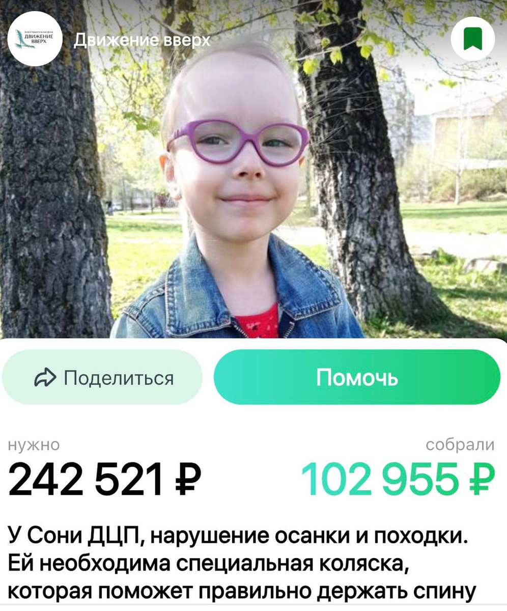 Ваша помощь очень нужна подопечным детям нашего фонда «Движение вверх» – Соне Науменко, Степану Уссу и Кириллу Яковлеву. Сбор средств осуществляется в приложении Tooba. Соня Науменко родилась в срок, крепкой и здоровой на вид, с хорошими показателями. Но гипоксия при родах привела к кровоизлияниям в том числе и в сосудистые сплетения мозга. В 1 год и 3 месяца прозвучал диагноз «ДЦП» (детский церебральный паралич), спастическая диплегия. Это значит, что все четыре конечности поражены спастикой – мышцы постоянно напряжены, скованы, не дают двигаться свободно. В 3,5 года Соне сделали сложнейшую операцию на спинном мозге – селективную дорсальную ризотомию. Теперь девочка может стоять без поддержки, ходить по дому (пусть иногда и падая), подниматься по лестнице, держась за перила, даже учится прыгать. Сейчас Соне необходима специальная коляска, которая поможет правильно держать спину, ставить ноги под нужным углом, чтобы не усугубить состояние здоровья. Степе всего 5 лет, и его жизнь – это