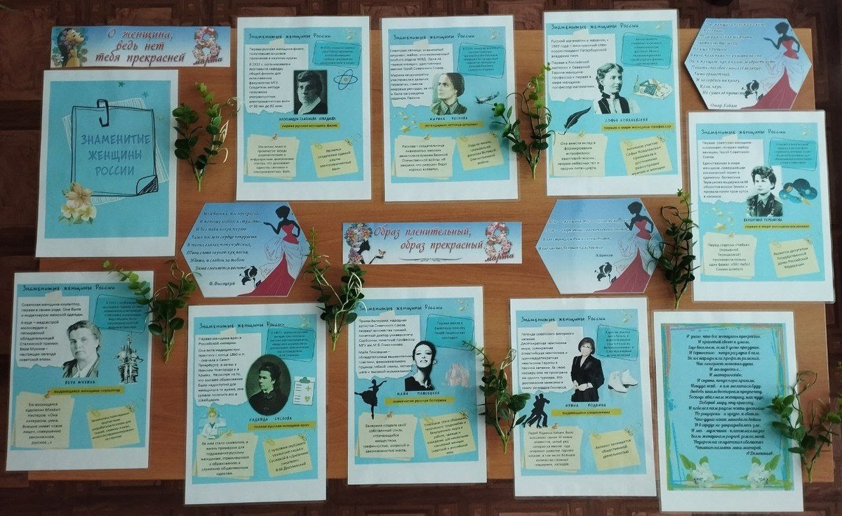 Колонка библиотекаря Я знаю, что все женщины прекрасны. И красотой своею и умом. Еще весельем, если в доме праздник. И верностью, — когда разлука в нем. Не их наряды или профиль римский,- Нас покоряет женская душа. И молодость ее…И материнство, И седина, когда пора пришла. Покуда жив, — я им молиться буду. Любовь иным восторгам предпочту. Господь явил нам женщину, как чудо, Доверив миру эту красоту. И повелел нам рядом жить достойно. По рыцарски — и щедро, и светло. Чтоб души наши миновали войны И в сердце не закрадывалось зло. И мы — мужчины — кланяемся низко Всем женщинам родной земли моей. Недаром на солдатских обелисках Чеканит память лики матерей. В нашей библиотеке прошла выставка "О женщина, ведь нет тебя прекрасней!", приуроченная к международному женскому дню. В выставке представлены очерки о знаменитых женщинах России: - Вере Мухиной (выдающаяся женщина-скульптор) - Надежде Сусловой(первая русская женщина-врач) - Александре Глаголевой-Аркадьевой (первая русская женщина-физи