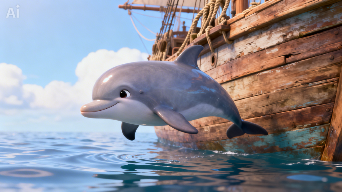 Элли встретила в море дельфина и теперь плыла вместе с ним к кораблям.