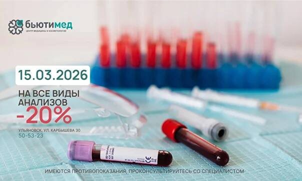 ! И только в этот день действует скидка 20%. Почему важно сдавать анализы регулярно? ✔ Помогают выявить скрытые воспаления и нарушения обмена веществ ✔ Контролируют работу печени, почек, щитовидной железы ✔ Показывают уровень холестерина, сахара, ферритина и других важных показателей ✔ Дают врачу полную картину вашего здоровья Анализы — это базовый шаг к пониманию своего организма и сохранению энергии на годы вперёд 💎 📍 Ульяновск, ул. Карбышева, 30 📞 Запись: 50-53-23 📞 +7 (8422) 50-53-23 МАКС +79272706126 или через наш сайт 🌐 Берегите здоровье — подарите себе спокойствие и уверенность ❤️ Имеются противопоказания. Необходима консультация специалиста. #БьютиМед #анализы #Ульяновск #здоровье #клиникаульяновск