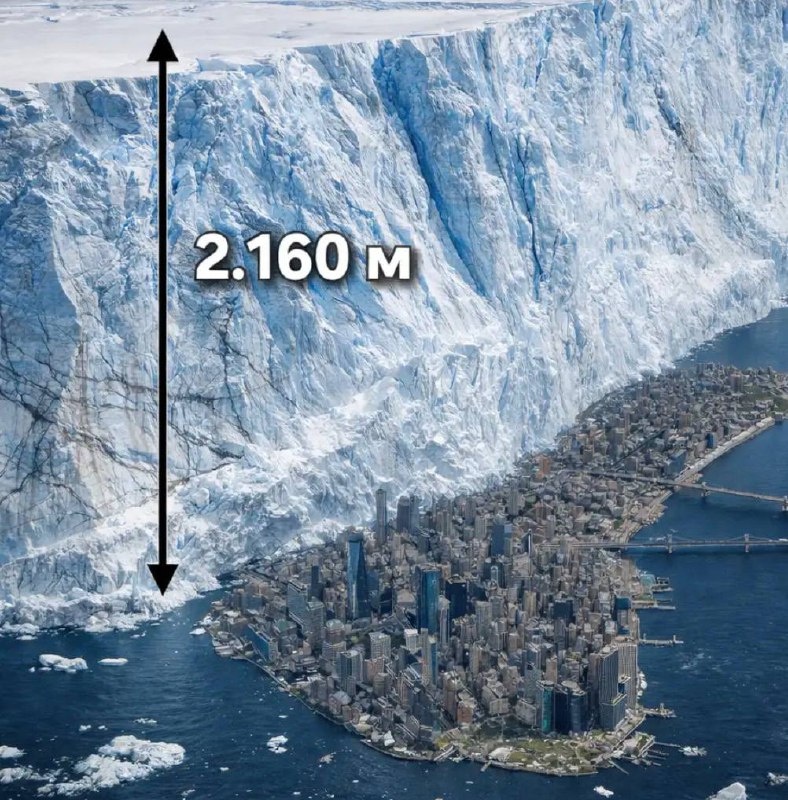 Наглядное сравнение толщины антарктического льда с крупным городом
