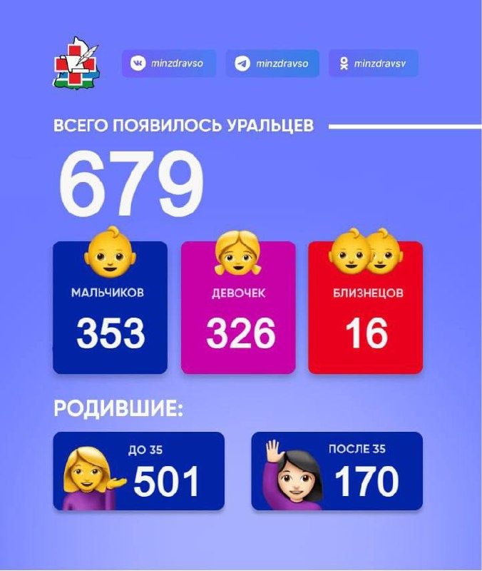 : 353 мальчика и 326 девочек, из них 8 пар близнецов! 501 мама родила до 35 лет. 170 мамочек родили после 35 лет. Для одной свердловчанки это стали восьмые по счету роды, для двух других – шестые.